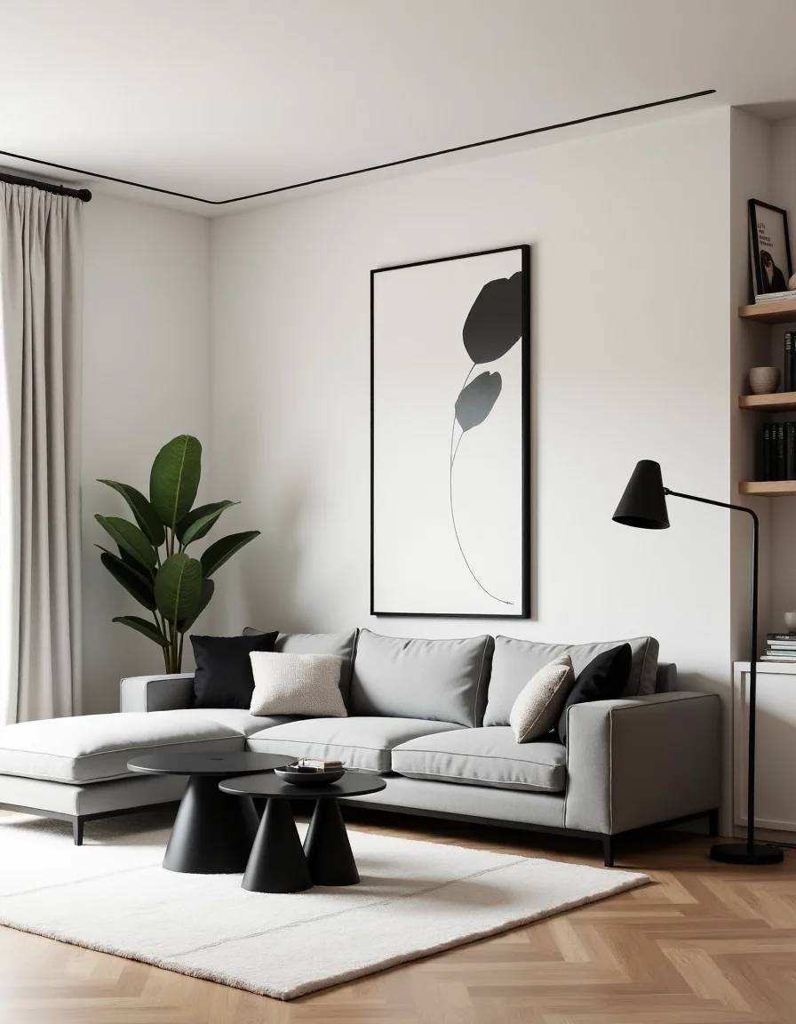 The living room exudes a minimalist aesthetic with sleek lines and a serene ambiance. A large, soft gray sectional sofa rests against a wall, adorned with a few monochrome cushions in various textures; two black geometric coffee tables sit effortlessly in front, one slightly larger, creating an asymmetrical balance. An 8x10 white wool area rug softly grounds the space, providing warmth against polished wood flooring. A single large abstract black-and-white painting hangs above the sofa, drawing the eye, while a tall, monochromatic floor lamp with a slender body illuminates the corner beside a simple potted snake plant, adding a touch of life without cluttering the space. Sleek shelves display a few curated books and a delicate ceramic vase, carefully arranged to maintain the air of simplicity that defines this minimalist retreat.