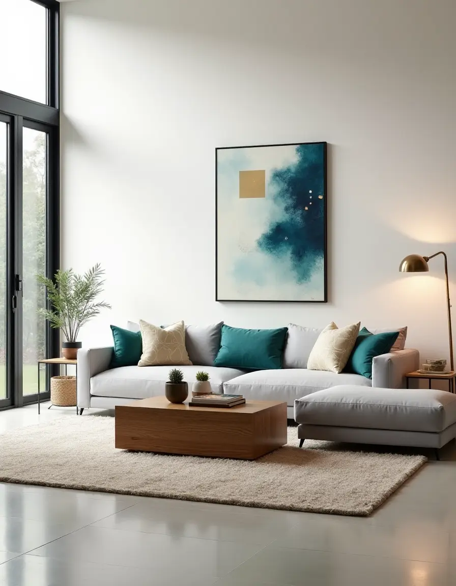 The living room features a sleek modern design with an open layout and abundant natural light filtering through large floor-to-ceiling glass windows. Centered in the room is a plush, light gray sectional sofa adorned with soft, geometric-patterned throw pillows in subtle shades of teal and cream. A minimalist wooden coffee table with a rich walnut finish sits atop a cozy, textured area rug in a muted, neutral tone, grounding the space. Flanking the sofa are stylish glass side tables, each topped with small potted succulents, and a contemporary floor lamp with a slender metallic base providing warm ambient lighting. The walls are painted in a crisp white, with a large abstract artwork showcasing splashes of blue and gold, enhancing the modern aesthetic of quality materials and simplicity.
