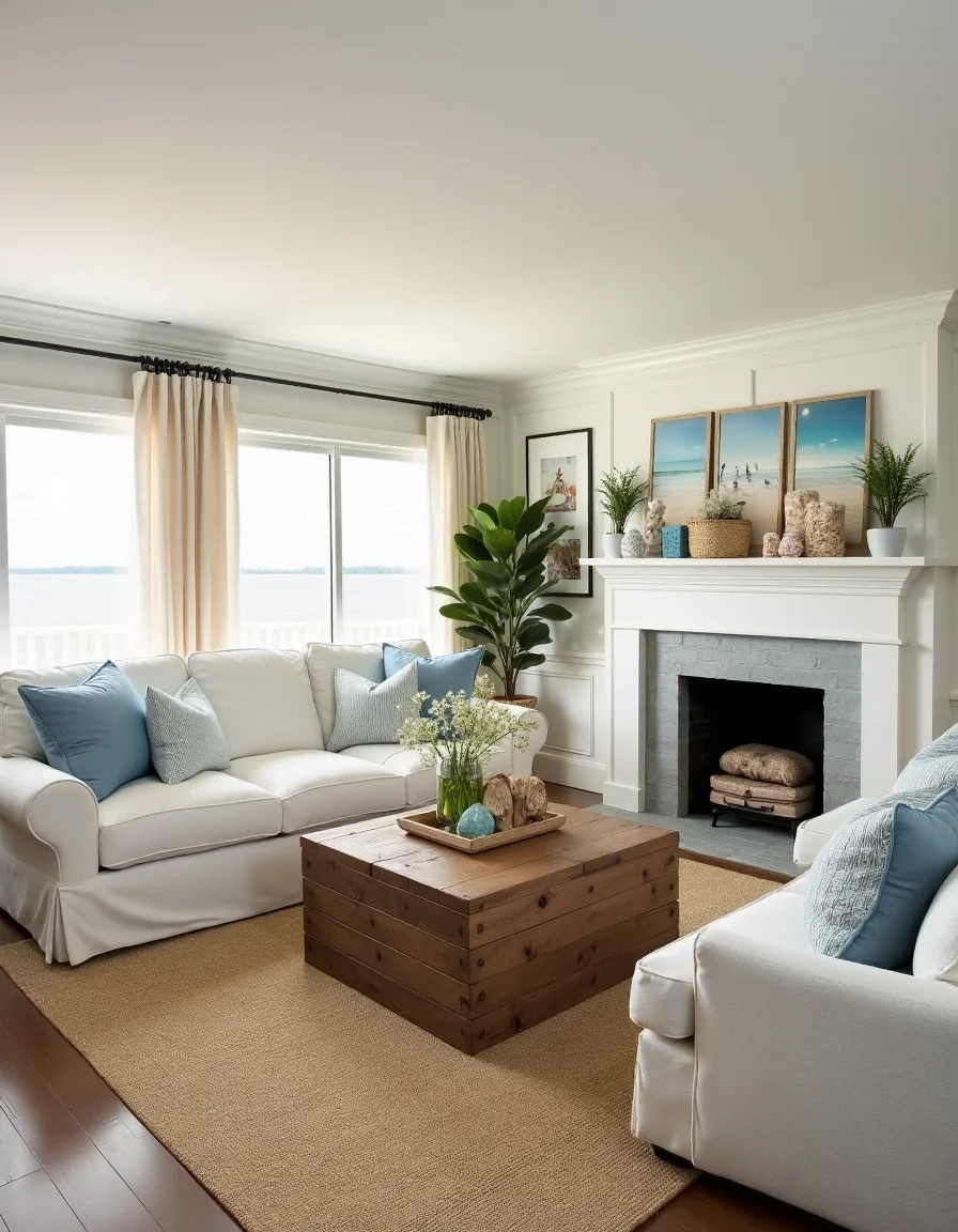 This serene seaside living room exudes a breezy, coastal vibe, featuring a striking white sectional couch with plush, oversized cushions adorned in light blue and sandy beige throw pillows that echo the colors of the shore. A sturdy reclaimed wood coffee table sits centrally, its natural texture contrasting beautifully with a handwoven jute area rug beneath it, inviting barefoot comfort. Flanking the couch are tall, airy sheer curtains that billow gently with the ocean breeze, allowing soft sunlight to pour in, while an assortment of nautical-themed decorations, such as a driftwood centerpiece and ceramic starfish accents, line the mantel of a cozy, whitewashed fireplace. On the walls, framed photos of beach vistas and seashell art enhance the theme, while a couple of indoor plants in woven baskets add fresh greenery and life to the space, further enhancing the cheerful seaside ambiance.