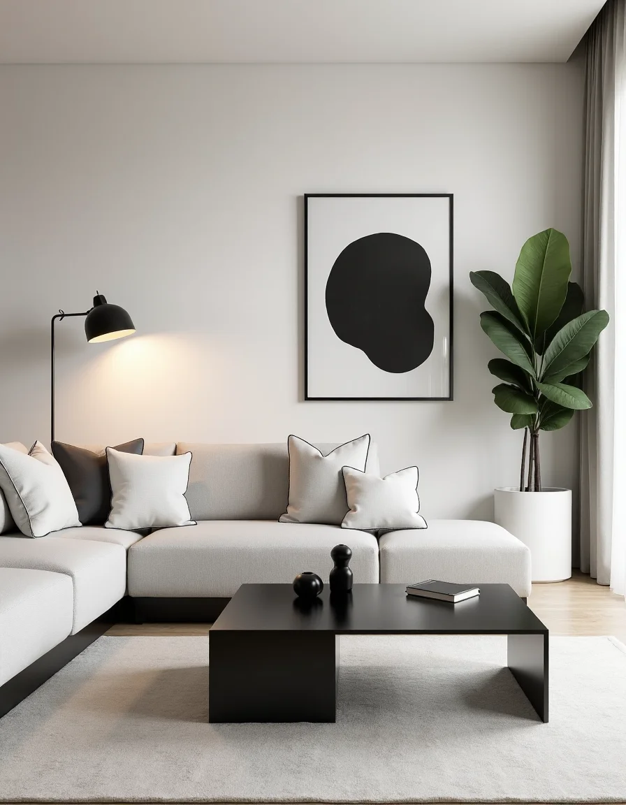 The living room is designed in a minimalist style with a soft, monochrome palette dominated by whites and shades of gray. A sleek, low-profile sectional sofa in light gray sits against one wall, complemented by a pair of textured white accent pillows. In the center of the room, a rectangular coffee table made of tempered glass and matte black metal serves as a perfect multi-functional piece, providing a surface for decor and space for storage underneath. To add visual interest, a large abstract painting in black and white hangs on the wall opposite the couch, while a tall indoor plant in a simple white planter punctuates the corner, bringing a touch of nature into the streamlined space. Lastly, a minimalist floor lamp with an elongated structure and warm LED light stands next to the sofa, enhancing the inviting ambiance.