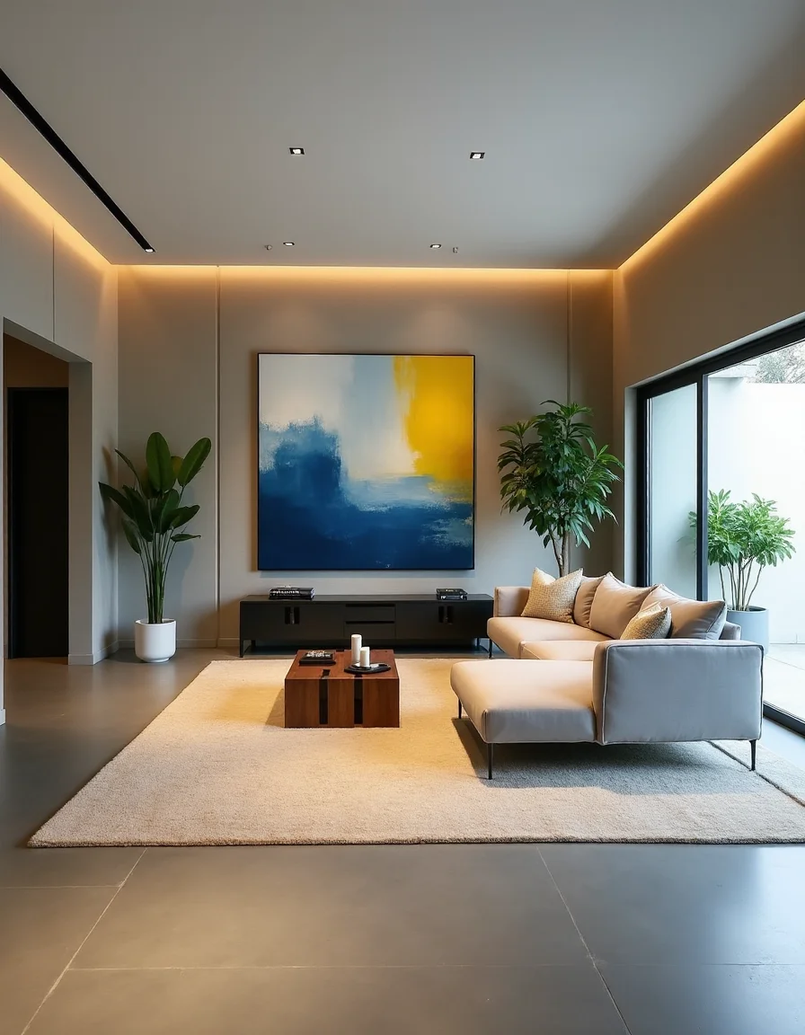 The living room exudes modern luxury with its emphasis on quality materials and clean lines. Dominating the space is a sleek, sectional sofa upholstered in a soft, dove-gray fabric, arranged in an L-shape around a low-profile, walnut coffee table with geometric cutouts. A large abstract painting in vibrant blues and yellows hangs above a minimalistic media console, finished in matte black, which complements the polished concrete flooring adorned with a plush cream area rug. Tall potted plants, such as a snake plant and fiddle leaf fig, bring life to the corners of the room, while strategically placed LED recessed lights enhance the clean architectural lines of the space, creating a warm and inviting ambiance.