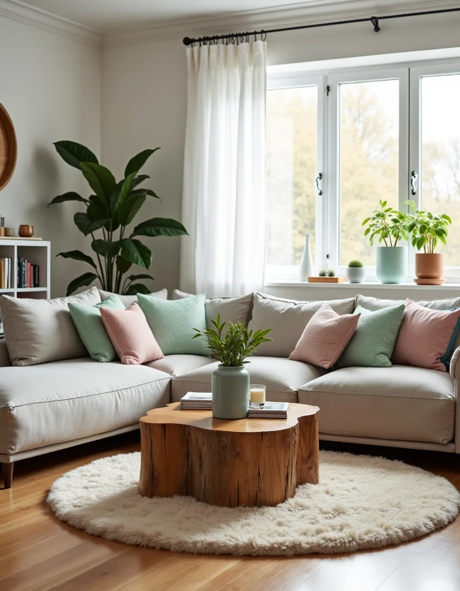 The living room exudes a cozy Scandinavian charm, featuring a spacious layout with light oak hardwood floors that create an inviting atmosphere. A large, soft, light gray sectional sofa is complemented by several textured knit throw pillows in pastel shades of mint green and dusty pink, inviting relaxation. Against the far wall, a minimalist white shelving unit showcases a collection of indoor plants, ceramic vases, and a few carefully curated books, adding a touch of warmth and nature to the space. A plush, cream-colored area rug lies under the coffee table, which is made of reclaimed wood and topped with a few magazines and a scented candle, providing both function and style. The room’s large windows allow for ample natural light, adorned with sheer white curtains that softly filter sunlight, while a decorative wall clock made of birch wood adds cohesive natural elements to the comfortable design.