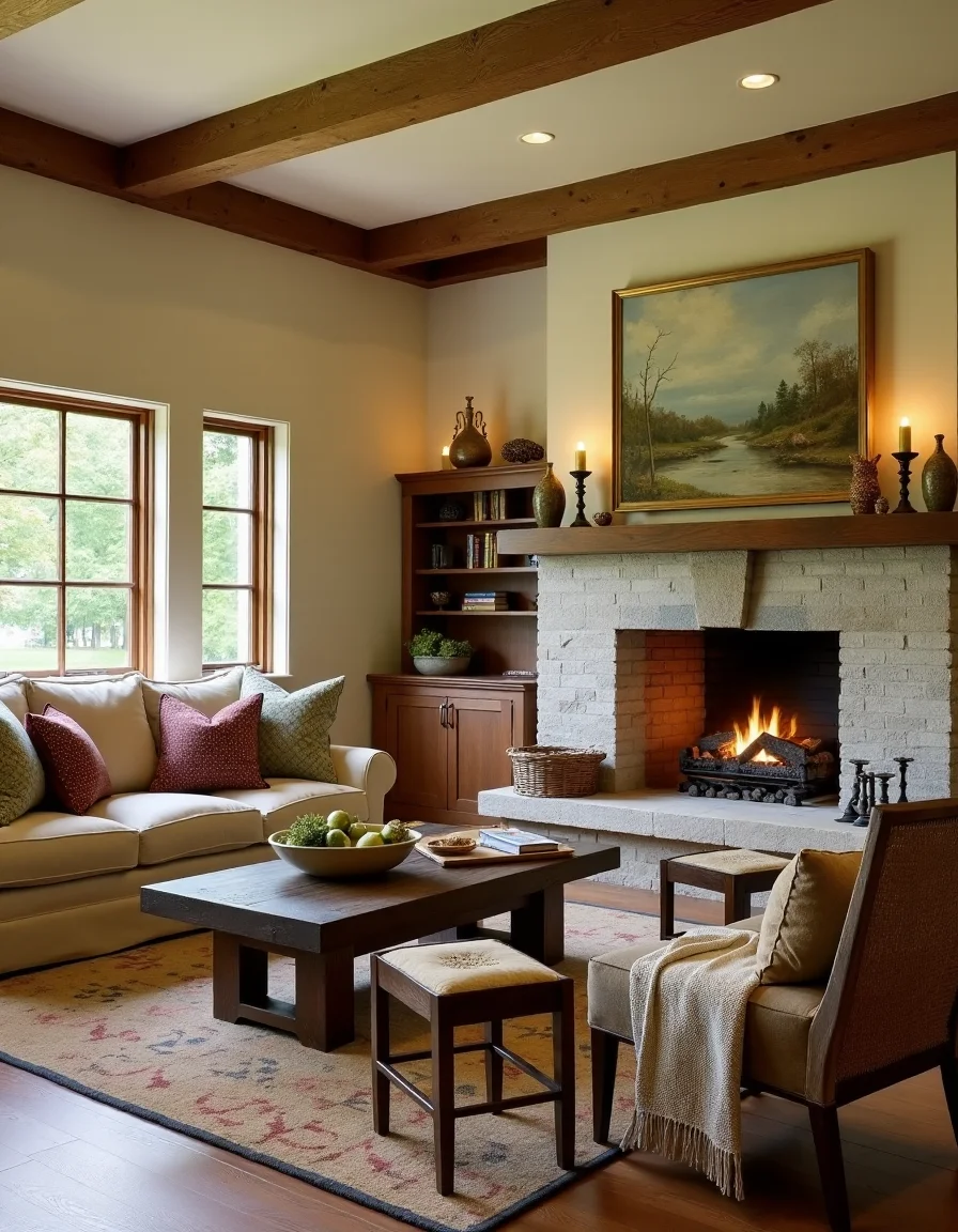 The living room exudes a warm, inviting country charm, anchored by a large, rustic stone fireplace that dominates one wall, complete with a classic wooden mantle adorned with ornamental candles and hand-painted pottery. A deep beige, slipcovered sofa sits center-stage, complemented by an assortment of plush, patterned throw pillows in shades of muted greens and faded burgundies. A large, distressed wooden coffee table occupies the center of the room, surrounded by mismatched, weathered wooden chairs featuring soft, handwoven seat cushions for added comfort. The walls are painted a soft cream, accented with landscapes and cherished family photographs in vintage frames, while charming hand-stitched quilts drape over the backs of the chairs, enhancing the homely atmosphere. In one corner, a small bookshelf filled with well-loved novels and trinkets showcases the handcrafted details of country living.