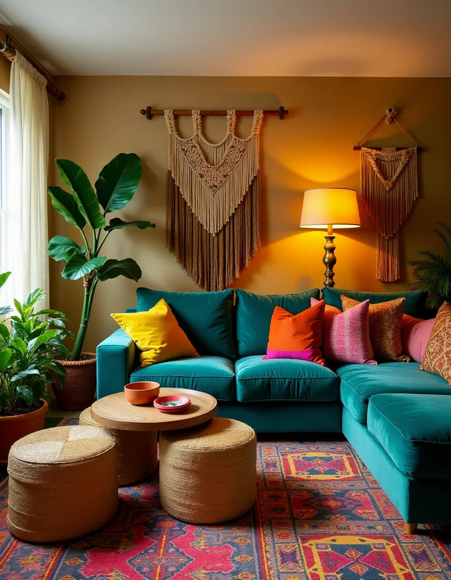The living room exudes a vibrant bohemian spirit, characterized by an eclectic mix of textures and colors that bring a lively harmony to the space. A plush, oversized, deep teal velvet sofa sits at the center, adorned with an array of brightly patterned cushions in hues of mustard yellow, burnt orange, and fuchsia. Surrounding the sofa, an assortment of potted plants, including a tall fiddle leaf fig and cascading pothos, breathe life into the room, set against a warm beige accent wall. In one corner, a rustic wooden coffee table surrounded by mismatched rattan ottomans invites relaxation, while embroidered wall hangings and a stunning macramé curtain contribute to the boho aesthetic. Ambient lighting is provided by a vintage brass floor lamp, casting a soft glow over a cozy, colorful woven area rug that unites the space with bursts of color.