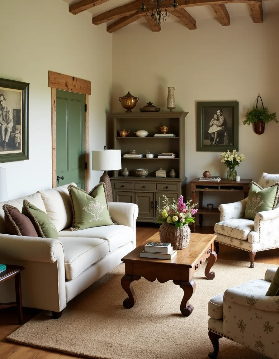 The living room exudes a warm and inviting country style, adorned with a rich palette of earthy tones and soft neutrals. A plush beige linen sofa, accented with embroidered throw pillows in muted greens and browns, is placed centrally, inviting relaxation. Nearby, a rustic oak coffee table with intricately carved legs is adorned with a woven basket filled with seasonal flowers. The walls are decorated with framed vintage family photographs in distressed wooden frames, and an antique wooden sideboard displays charming ceramics and a few potted herbs, enhancing the quaint feel of the room. A large, artisanal jute area rug anchors the space, and a pair of cozy armchairs upholstered in a soft floral pattern sit nestled in one corner, flanked by a bookshelf filled with country-themed novels and trinkets, completing the serene ambiance.