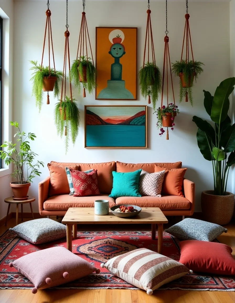 The living room exudes a vibrant bohemian vibe, where soft hues of terracotta and rich turquoise come together to create a cozy and inviting space. An intricately patterned vintage Turkish rug in warm earth tones sprawls across the hardwood floor, anchoring the furnishings. A mismatched assortment of plush floor cushions in varying shapes and sizes, adorned with ethnic prints and pom-poms, lies casually scattered around a rustic wooden coffee table. Above the table, an array of macramé plant hangers dangle from the ceiling, showcasing cascading emerald green ferns and flowering plants, while walls are adorned with layered artworks featuring bold colors and eclectic frames that celebrate cultural diversity.
