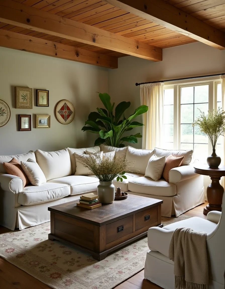 The living room exudes a cozy country charm, featuring a plush, oversized sectional couch draped in soft, cream-colored slipcovers. A tufted, pale beige armchair sits adjacent, accompanied by a weathered wooden side table topped with a rustic lantern for ambiance. The walls are painted in soft taupe, complemented by handmade quilts hung artfully, while a vintage rug with a muted floral pattern sprawls beneath an old, dark wood coffee table adorned with family heirlooms and fresh wildflowers in an antique mason jar. Large, warm-toned wooden beams showcase the ceiling, casting gentle shadows, while lush greenery in earthen ceramic pots brings a breath of the countryside indoors.