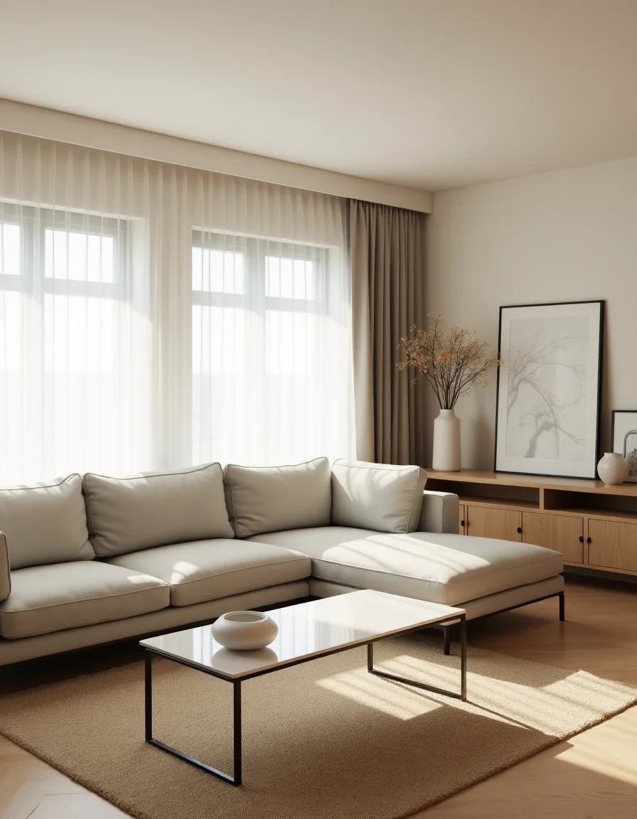 The living room embodies a minimalist style, characterized by streamlined furniture and subtle decor. A low-profile, light gray sectional sofa occupies the center, paired with a sleek, white coffee table made of glass and steel, enhancing the room’s airy feel. To the side, a minimalist shelving unit in natural wood displays a few curated decorative items, such as a monochromatic vase and a minimalist sculpture, contributing to the neutral palette. The walls are painted a soft beige, while a simple jute area rug anchors the seating arrangement, complementing the color scheme and adding texture. Natural light filters in through unobtrusive sheer curtains, enhancing the serene atmosphere of the space.