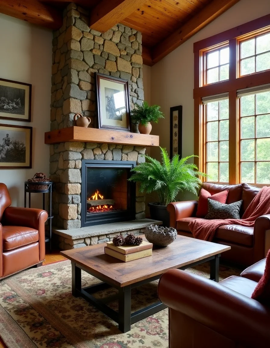 This rustic living room features a stunning stone fireplace as the focal point, framed by reclaimed wooden beams carrying a warm amber hue. Two plush leather armchairs, deeply cushioned and in a rich chestnut color, are placed flanking the fireplace, while a well-worn, oversized red plaid throw blanket rests across one of the chairs, inviting warmth. A large, distressed wooden coffee table takes center stage, its surface adorned with fragrant pinecones, a few rustic books, and a hunting-themed décor piece. The walls are adorned with vintage black-and-white photos in rugged, weathered frames, and the space is enhanced by the presence of potted ferns resting on a wrought-iron plant stand near the window, allowing natural light to filter in and enrich the cozy atmosphere.