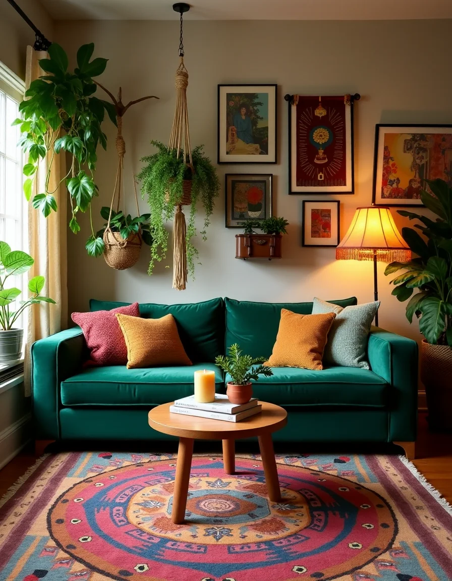 The living room showcases a vibrant bohemian style, saturated with earthy tones and a plethora of indoor plants that breathe life into the space. A large, deep green velvet sectional couch is centered against the wall, adorned with an assortment of mismatched, colorful throw pillows in varying textures, such as crochet and tie-dye. The hardwood floor is covered with a layered arrangement of patterned rugs, featuring bold geometric designs and warm earthy colors, while a low wooden coffee table made from reclaimed wood rests at the center, topped with assorted candles and a stack of art books. Hanging above are macramé plant hangers, overflowing with trailing pothos and ferns, while an eclectic gallery wall displays an array of framed tapestries and vibrant artwork. Soft ambient lighting emanates from vintage floor lamps with fringed shades, creating a cozy, inviting atmosphere that invites relaxation and conversation.