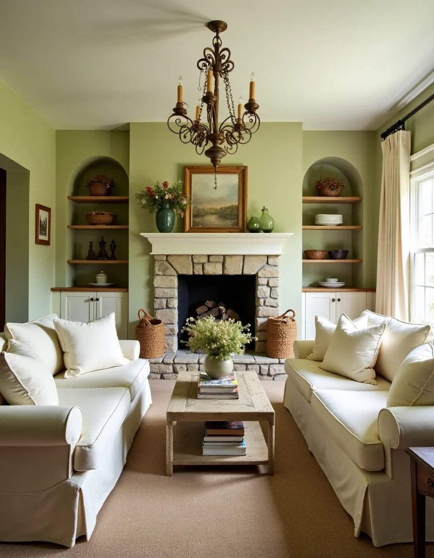 The living room features a warm country style, showcasing a cozy yet sophisticated ambiance. Soft, muted pastel walls in hues of pale sage and buttery yellow provide a soothing backdrop, while a pair of vintage slipcovered sofas in creamy cotton gently contrasts with the rustic charm of the rough-hewn stone fireplace at the far end of the room. A weathered wooden coffee table sits centrally, adorned with a vase of fresh wildflowers, adding a touch of whimsy and color. Around the room, various curated accents like handcrafted wooden shelves displaying quaint ceramic dishes and a woven basket overflowing with soft, knitted throws lend an inviting feel, while elegant Country-style chandeliers cast a soft glow over the space, enhancing its charm.
