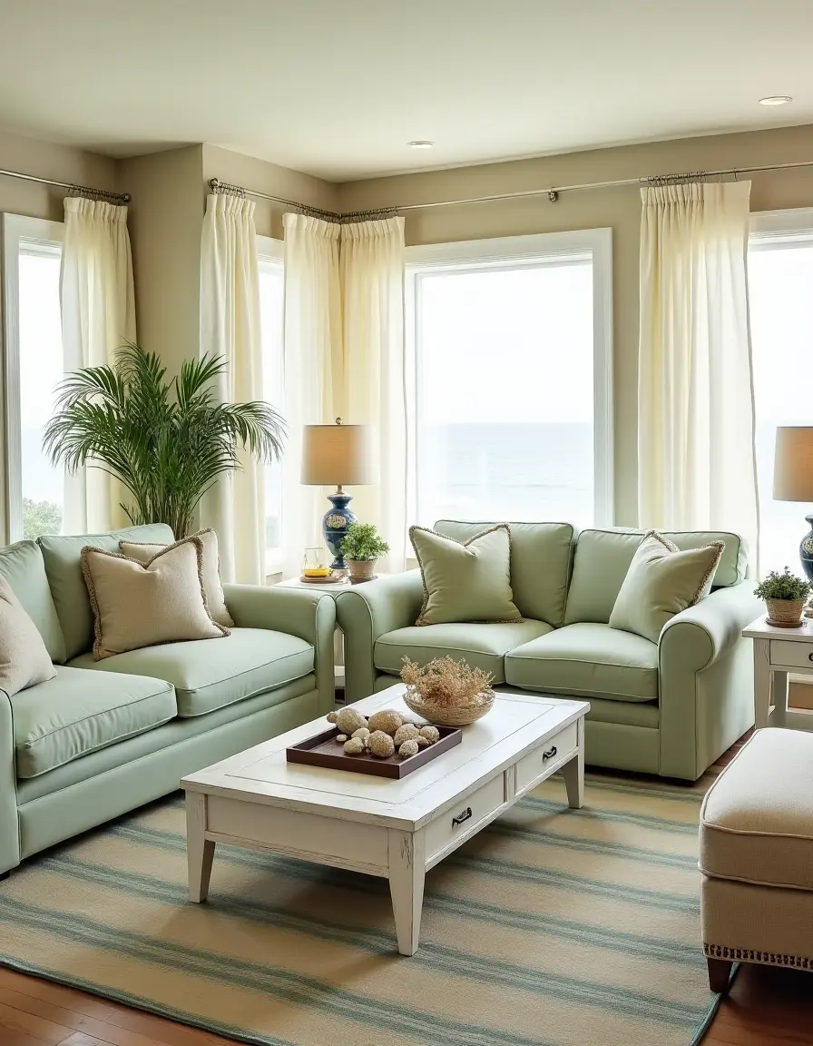 The living room exudes a tranquil seaside vibe, characterized by soft beige shades that envelop the walls and are complemented by large, plush seating arrangements featuring light seafoam green and sandy taupe fabrics. A striped carpet in sandy beige and ocean blue tones anchors the space, adding both texture and a sense of rhythm. An oversized, distressed white wooden coffee table sits at the center, adorned with a collection of seashells and a driftwood centerpiece, evoking a beachy feel. Lush, potted ferns and a decorative nautical-themed lamp placed on one side table enhance the natural flow, while large windows dressed in sheer linen curtains allow ample natural light to flood the room, creating a serene atmosphere perfect for relaxation.