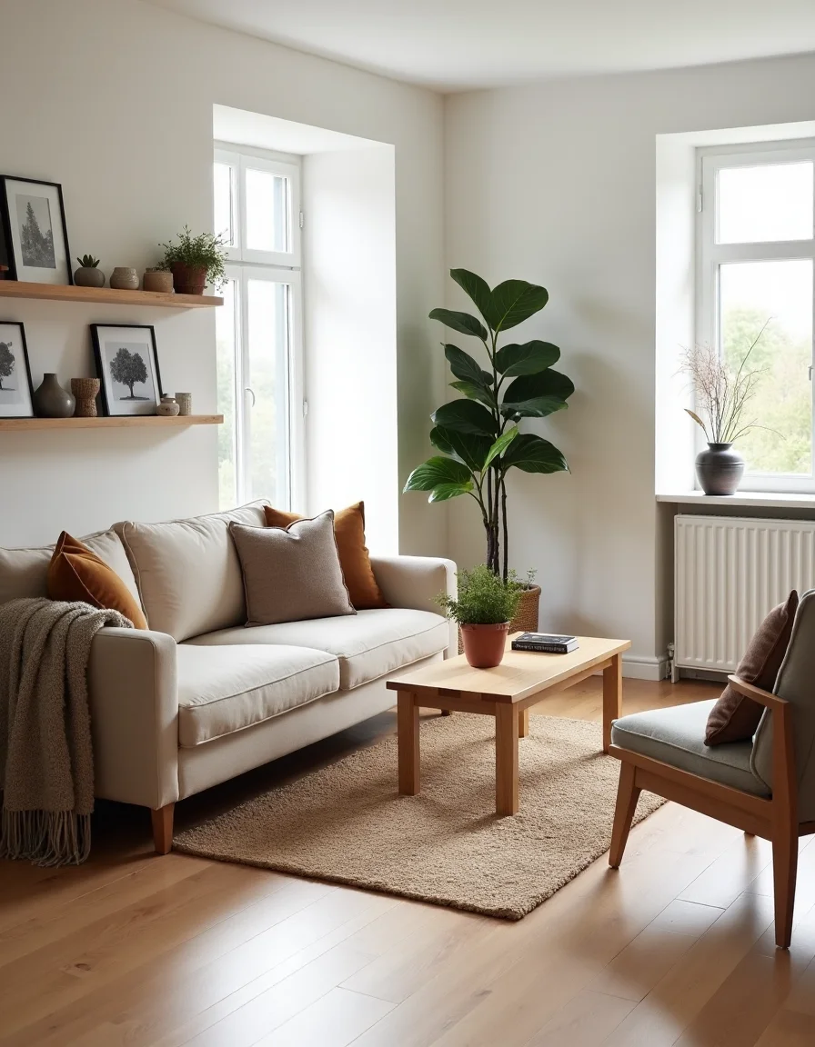 The living room is a serene Scandinavian oasis, featuring a minimalist layout grounded in functional design. The walls are painted a soft, cool white that beautifully complements the light oak wood flooring, creating an airy ambiance. A spacious beige sectional sofa sits at the center, adorned with an array of textured throw pillows in muted earth tones and a cozy knitted blanket draped over one arm. Opposite the sofa, a natural wood coffee table with a simple geometric design is placed atop a woven jute rug, while a sleek mid-century modern armchair, upholstered in light gray fabric, provides additional seating. The room is adorned with potted greenery, such as a tall fiddle leaf fig next to a large window, enhancing the natural brightness, and shelves lined with curated decor items like handmade ceramics and black-and-white photography, further amplifying the Scandinavian emphasis on functionality and understated beauty.