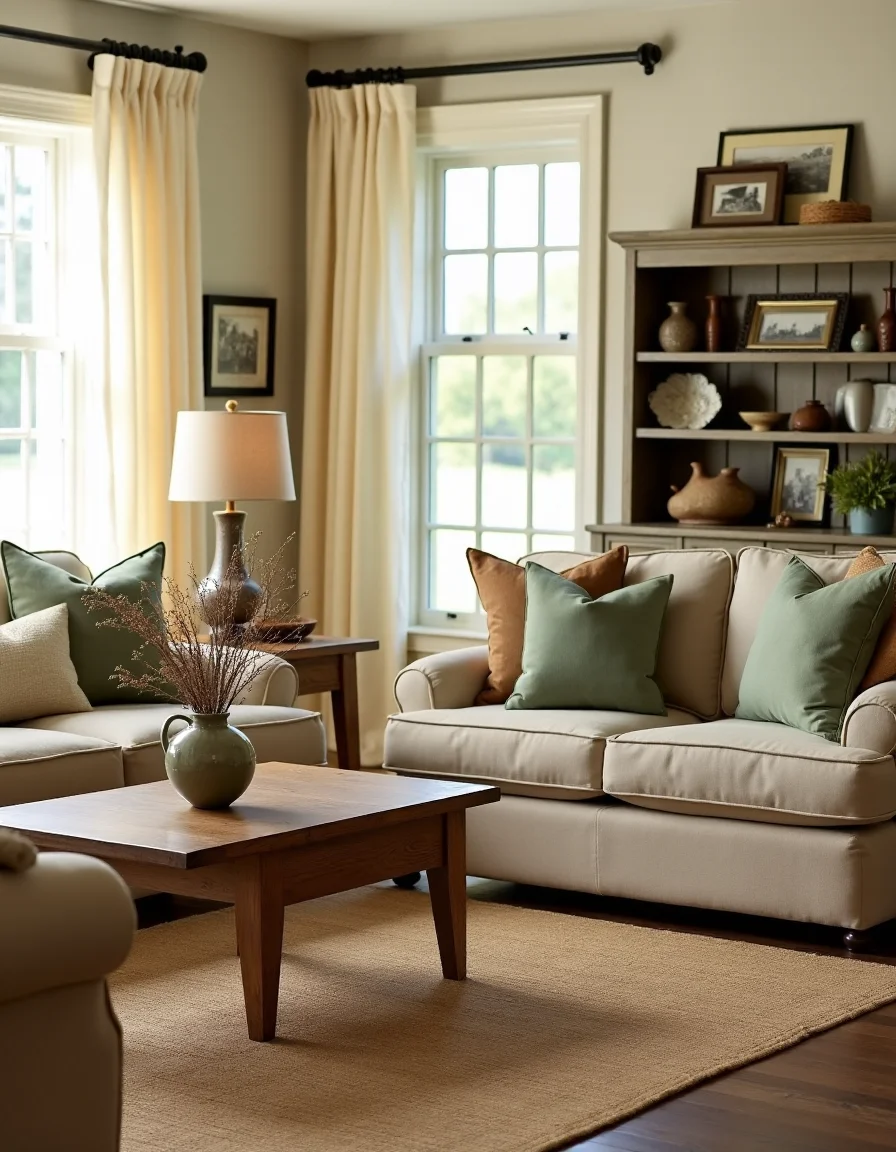 The living room embodies a warm, welcoming country style, characterized by a blend of earthy tones and soft neutrals. A handwoven jute area rug in beige lays beneath a rustic oak coffee table, which is styled with a small ceramic vase filled with fresh wildflowers. Two overstuffed sofas in light taupe flank the space, adorned with plush throw pillows in muted green and soft brown. A weathered wooden hutch occupies one corner, displaying timeless family heirlooms and a collection of framed black-and-white photographs, while a soft, natural light filters through sheer cream curtains, completing the cozy ambiance with a gentle touch.