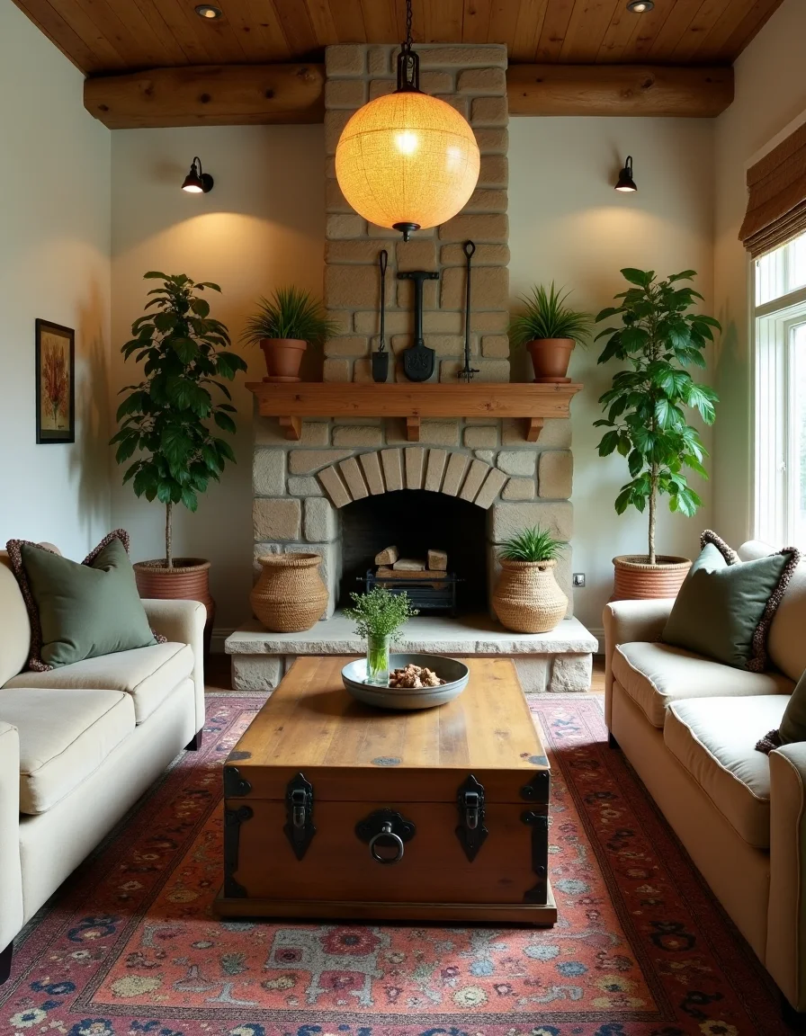 The living room exudes a rustic charm with its warm earthy tones and natural materials. A large reclaimed wooden coffee table sits at the center, surrounded by a pair of plush beige sofas laden with throw pillows in muted greens and browns. Behind these, a stone fireplace adorned with vintage iron tools and a handcrafted wooden mantle piece serves as a stunning focal point, while a large woven basket filled with logs rests beside it. Eucalyptus plants in terracotta pots add a refreshing touch of life, and an antique oak trunk doubles as a storage piece and additional surface space. The room is cheerfully lit with artisanal pendant lights, their textured glass casting a warm glow over the intricately patterned area rug that grounds the space.