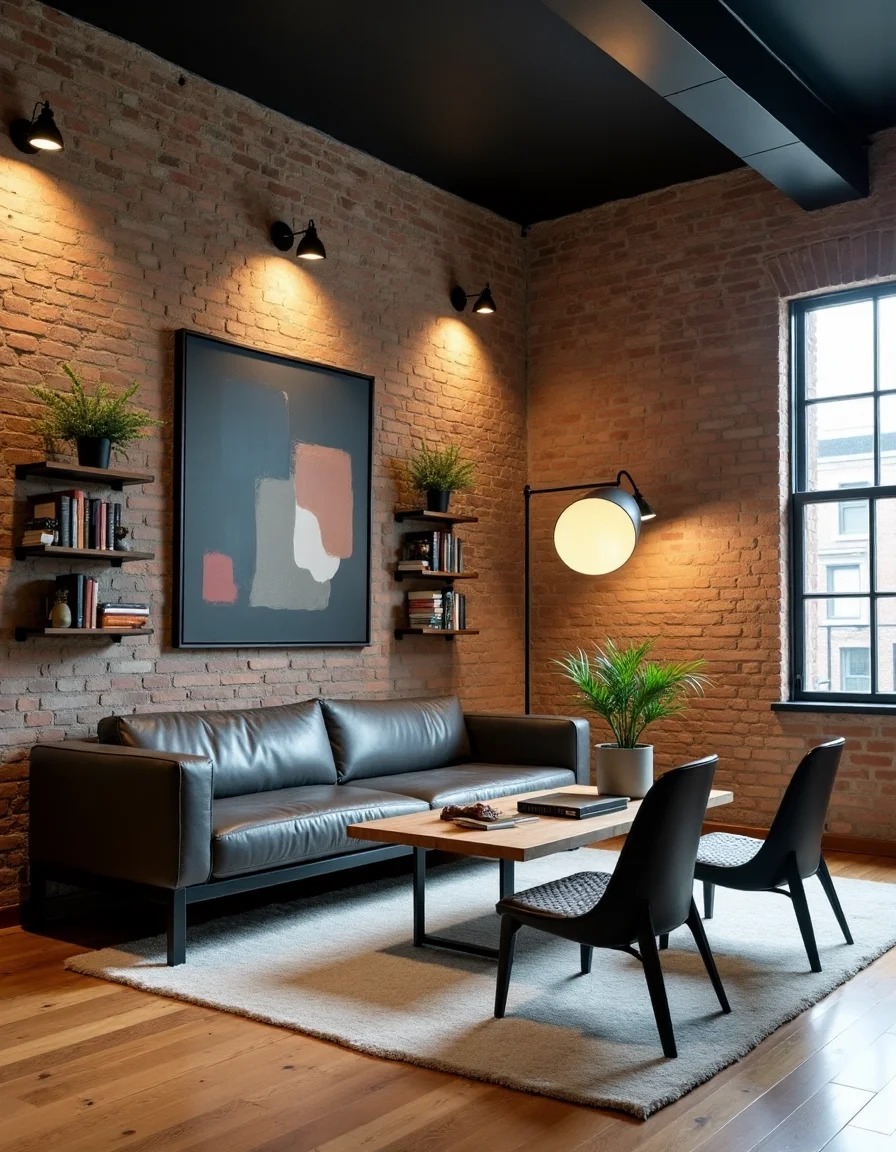 This industrial-style living room features an expansive layout with exposed brick walls and large windows that allow natural light to flood in, enhancing the space's rustic charm. Central to the room is a large, distressed leather sofa in deep charcoal gray, complemented by a pair of sleek metal accent chairs in matte black positioned around a rustic wooden coffee table with visible knots and grains. Against one wall, a set of three black iron shelves hold an eclectic mix of books, plants in concrete pots, and vintage industrial decor items, while the other wall showcases a striking piece of artwork, featuring abstract geometric shapes in muted earth tones. The flooring consists of hardwood with a weathered finish, and soft, warm lighting is provided by an oversized black metal floor lamp, creating a cozy yet edgy atmosphere for relaxation and social gatherings.
