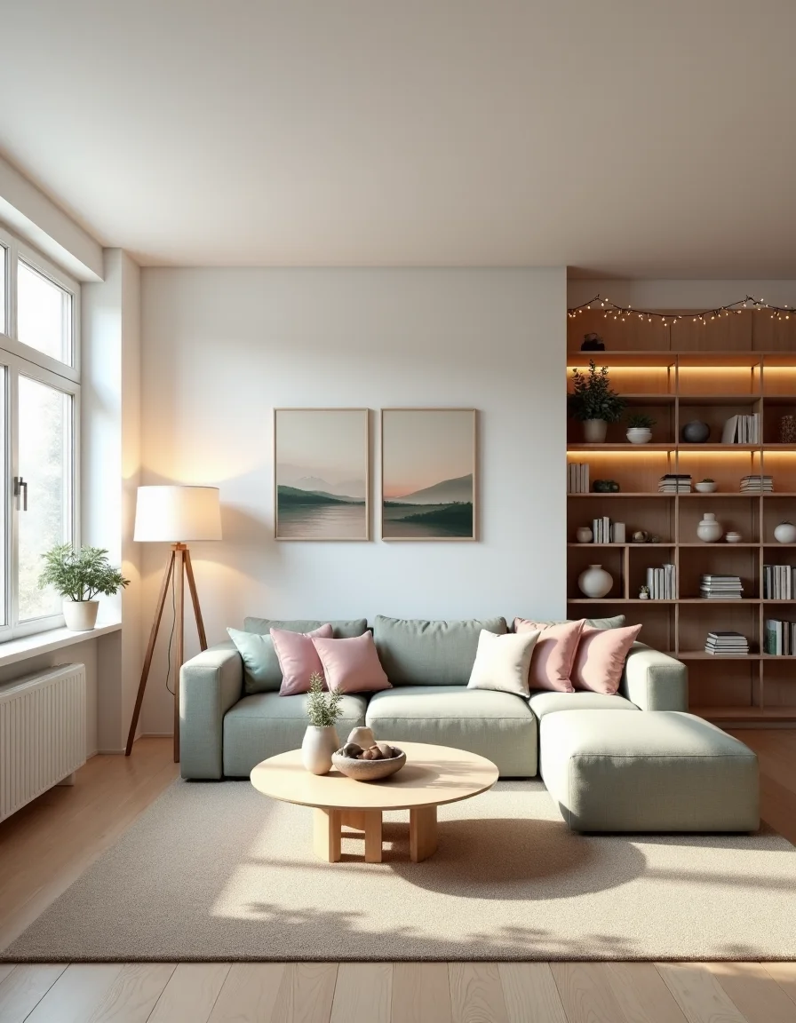 The living room exudes a cozy Scandinavian charm, featuring large windows that bathe the space in natural light, accentuating the soft white walls paired with light wooden floors. In the center, a plush beige area rug anchors a seating arrangement consisting of a modular grey sofa adorned with pastel cushions in soft pink and mint hues, while a round, pale wood coffee table sits invitingly in front. A tall bookshelf, filled with an array of books and tasteful decor items such as ceramic vases and potted plants, lines the back wall, intertwined with string lights for a warm ambiance in the evenings. Artful wall hangings in muted tones depict abstract landscapes, adding a personal touch, while a sleek floor lamp with a warm glow stands beside the sofa, offering functional lighting that complements the minimalist aesthetic.
