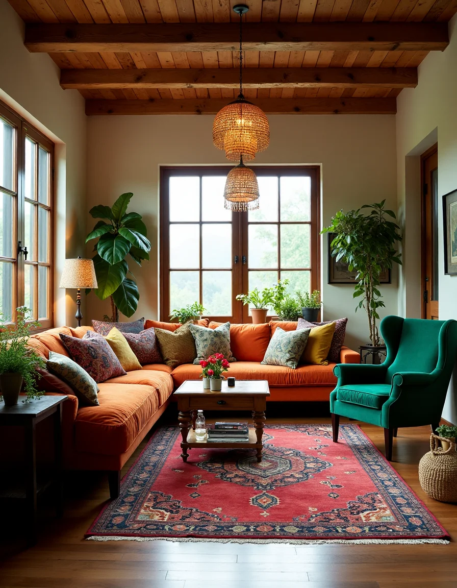 The living room is a stunning representation of bohemian style, bursting with vibrant colors and eclectic texture. Plush, multicolored ornamental carpets in rich reds, deep blues, and burnt oranges cover the wooden floor, bringing warmth and comfort to the space. A sprawling daybed adorned with an array of patterned throw pillows sits against one wall, while beaded chandeliers dangle gracefully overhead, their intricate designs creating dappled light patterns. Around the room, mismatched vintage furniture pieces—including a mid-century modern armchair in luscious emerald green and a rustic coffee table made from reclaimed wood—are harmoniously arranged, surrounded by potted plants that add a touch of nature and vibrancy to the atmosphere.