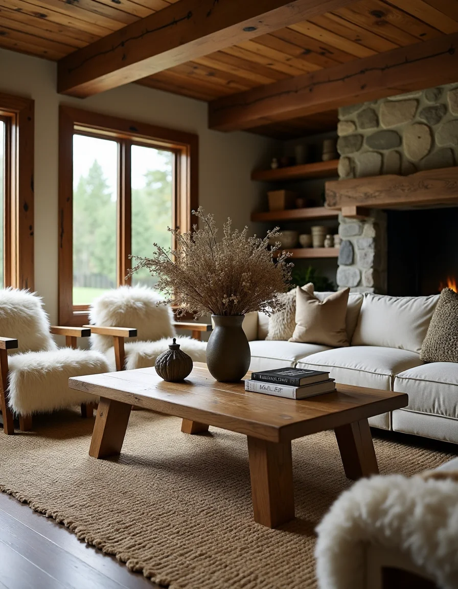 The living room exudes a warm rustic charm, dominated by a large, weathered oak coffee table set in the center, adorned with a handmade pottery vase filled with dried wildflowers. Surrounding the table are plush, fluffy armchairs upholstered in cream-colored fur, paired with a sturdy, dark leather sofa that features wood accents. The walls are clad with reclaimed barn wood, and accentuated by stone elements, including a grand fireplace made with rough-hewn stones, creating a cozy focal point. Soft woolen throws in muted earth tones are draped casually over the seats, while a woven jute rug anchors the room, adding texture underfoot and complementing the natural color palette of greens, browns, and soft whites.