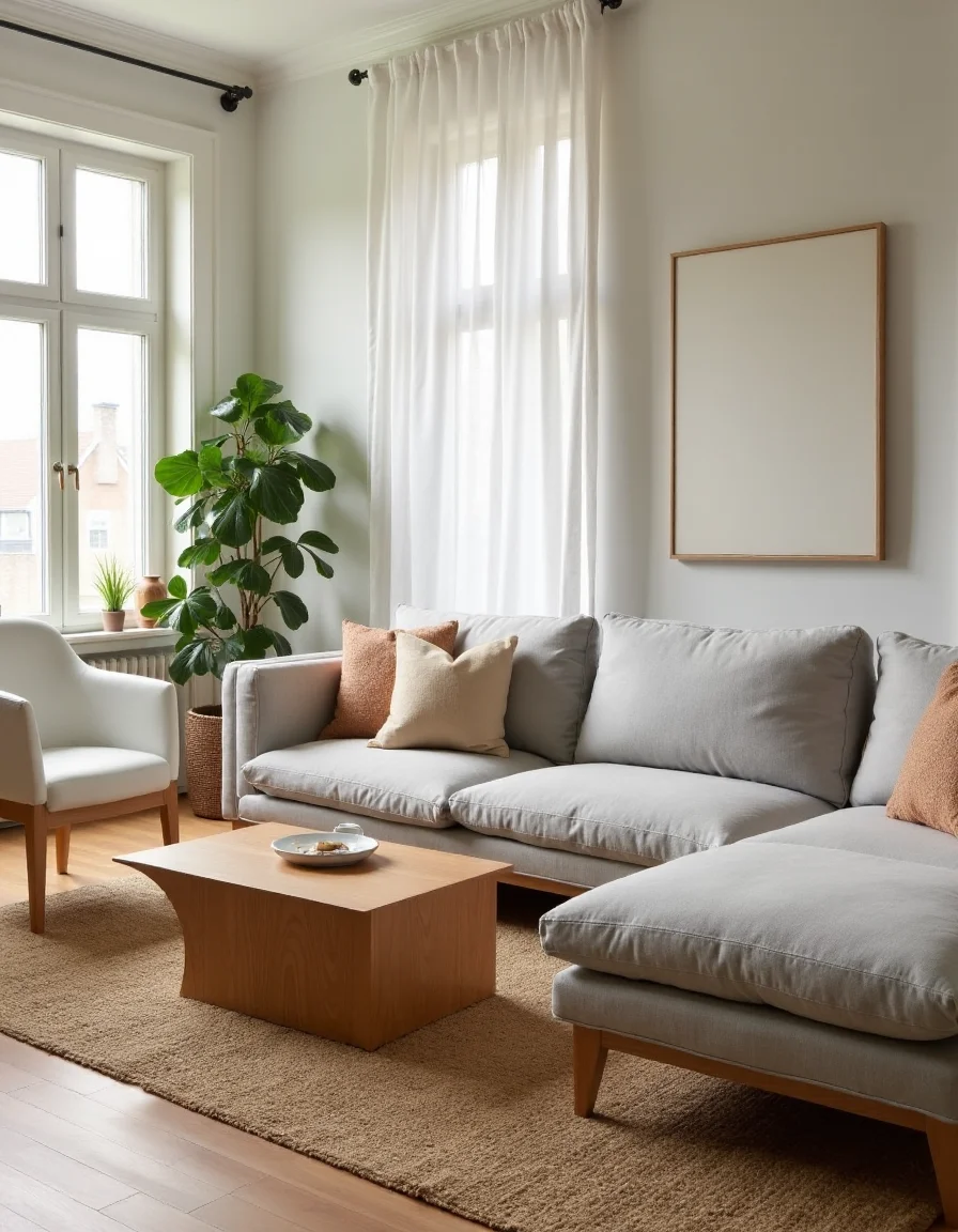 This Scandinavian-inspired living room exudes a calm and functional ambiance, featuring a large, plush light gray sectional sofa adorned with soft, textured throw pillows in muted pastel colors. A sleek, natural wood coffee table sits at the center, its clean lines showcasing the rich grain of the oak finish, surrounded by a pair of minimalist white accent chairs. The walls are painted in a warm, off-white hue, which enhances the natural light streaming in from a nearby large window, framed with sheer white curtains that gently flutter in the breeze. To add warmth and texture, a cozy, handwoven jute rug covers the floor, while a few potted green plants punctuate the space, bringing a touch of nature indoors.