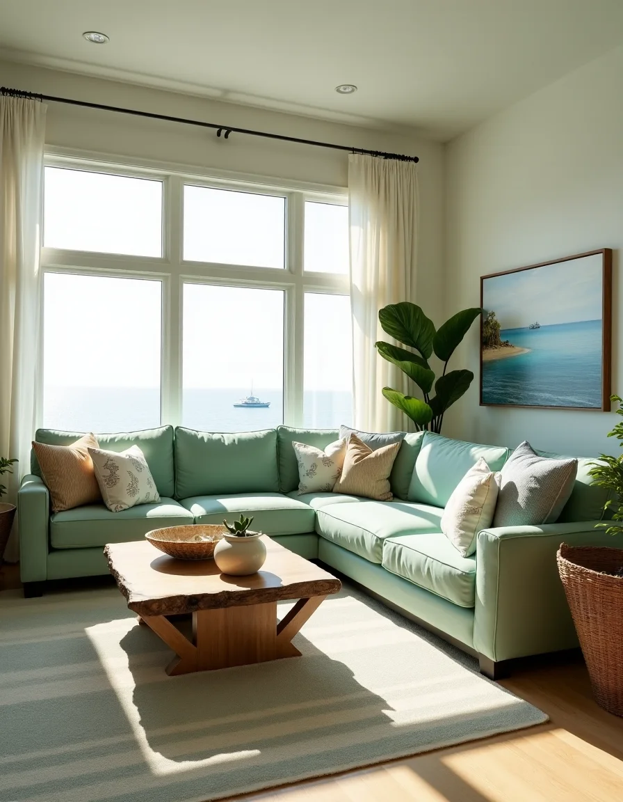 The living room embodies a serene seaside retreat vibe, with its expansive, large windows allowing plenty of natural light to flow in, framed by sheer, flowing light curtains that dance gently with the breeze. Underfoot lies a soft striped carpet in hues of sandy beige and ocean blue, evoking the colors of the beach. A large, comfortable sectional sofa in a light, seafoam green upholstery sits in the center, adorned with throw pillows in assorted coastal patterns, including starfish and shells. In one corner, a driftwood coffee table paired with wicker side tables gives a casual, rustic feel, while nautical-themed artwork graces the walls, featuring serene seascapes and marine life. Finally, indoor plants in ceramic pots add a burst of greenery, enhancing the relaxed, natural ambiance.