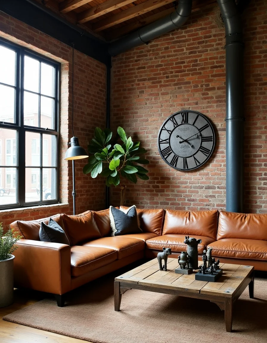 The living room showcases a stunning industrial design, characterized by exposed burnt brick walls that lend an earthy, rustic charm to the space. Ceiling-to-floor windows flood the room with natural light, and feature sleek black metal frames that enhance the industrial aesthetic. In the center, a large, distressed leather sectional in a muted tan echoes the vintage vibe, complemented by a low-profile reclaimed wood coffee table topped with an assortment of eclectic, metal sculptures. A vintage wrought-iron floor lamp provides ambient lighting next to a tall indoor plant in a galvanized pot, while subtle accents like exposed ductwork and an oversized wall clock with a weathered finish complete this stylish, urban loft ambiance.