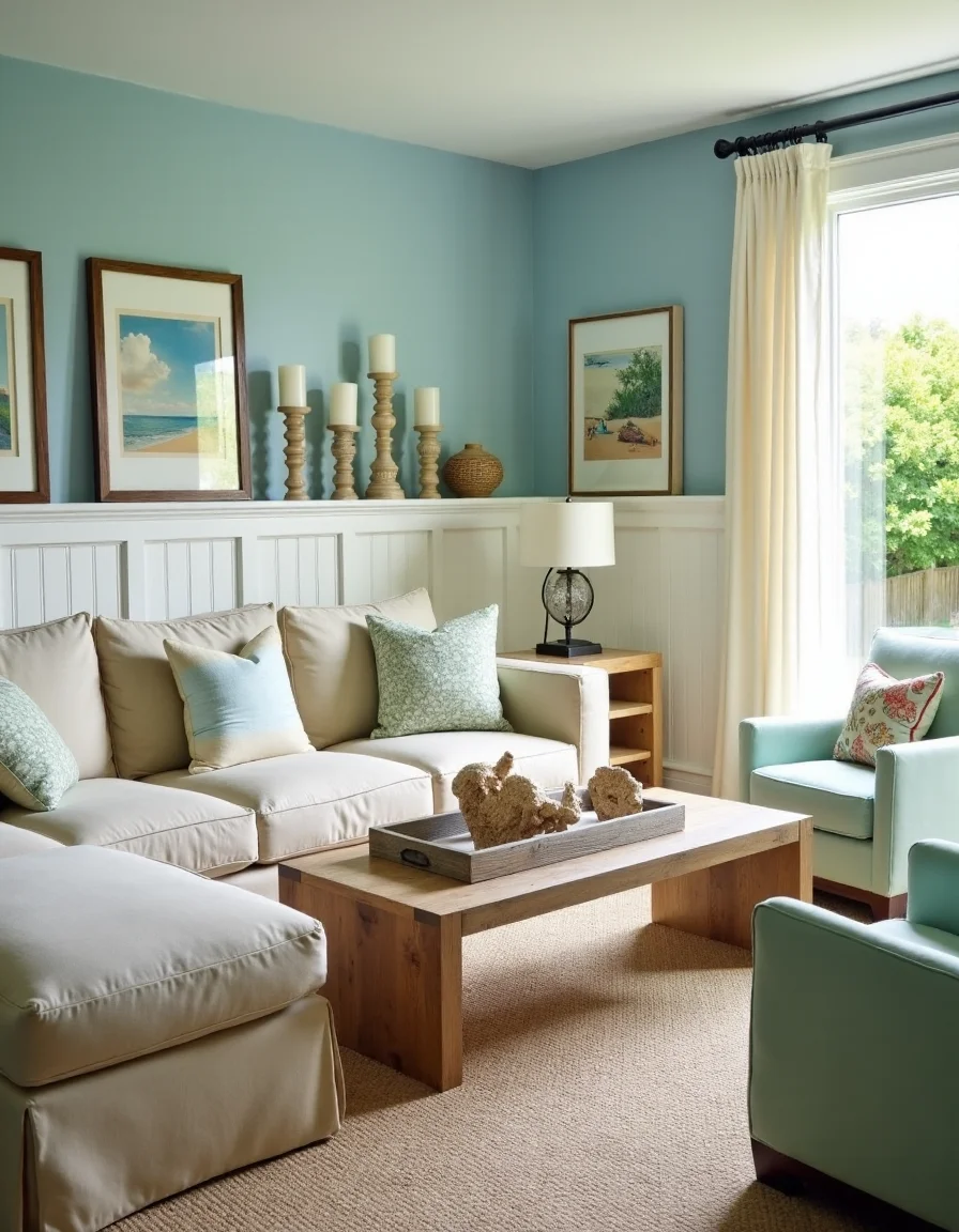 This serene seaside living room features a plush L-shaped sectional sofa upholstered in soft, sandy beige fabric, adorned with pastel-colored throw pillows depicting seashell and wave patterns. A lightweight, driftwood coffee table sits at the center, its weathered surface echoing the coast’s natural beauty. Two armchairs, upholstered in a light seafoam-green fabric, add a pop of color while inviting relaxation, situated near a large window that floods the space with natural light and offers views of a lush garden. The walls are painted in a crisp sky blue, with coastal artwork and framed beach photographs arranged as a gallery above a white, shiplap-style console table lined with candles and small driftwood sculptures, creating a harmonious blend of textures and a calming ambiance.