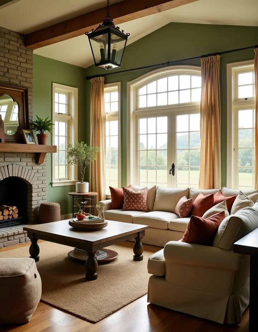This charming country living room is awash in natural light, thanks to the large, paneled windows adorned with simple linen curtains that gently filter in the sun's warmth. The warm, earthy tones of olive green, terracotta, and soft beige dominate the space, complemented by a cozy oversized sectional sofa finished in a soft, textured fabric and adorned with an array of plush, patterned throw pillows. A rustic, reclaimed wooden coffee table sits at the center on a woven jute rug, alongside a weathered stone fireplace that boasts a decorative mantel adorned with potted herbs and framed family photos. Walls are painted in a soothing sage green, accented by wooden beams that add character, while vintage lanterns hang from the ceiling providing ambient lighting, creating an inviting retreat that embraces the beauty of country living.