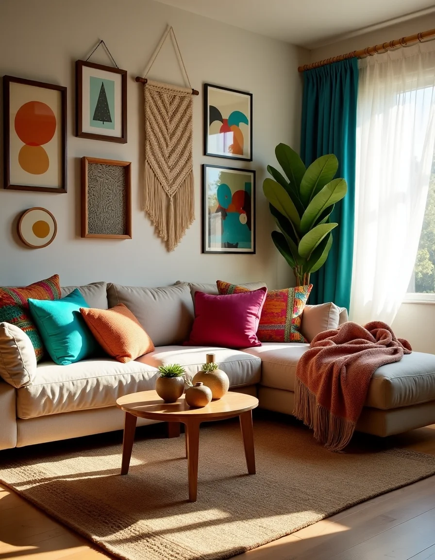 The living room embodies a vibrant bohemian style, where comfort meets an eclectic mix of colors and textures. A large, plush sectional sofa is draped with a wild assortment of colorful, patterned throw pillows in shades of turquoise, burnt orange, and deep magenta, inviting relaxation. Above the sofa, an assortment of framed art pieces, inspired by tribal patterns and abstract designs, create a dynamic gallery wall, while a vintage macramé hanging adds warmth and character. The space is anchored by a textured jute rug that softens the floor beneath a low wooden coffee table, adorned with hand-painted pottery and succulent plants. Soft, billowing sheer curtains allow gentle sunlight to filter in, casting playful shadows across the room, enhancing its cheerful and inviting atmosphere.
