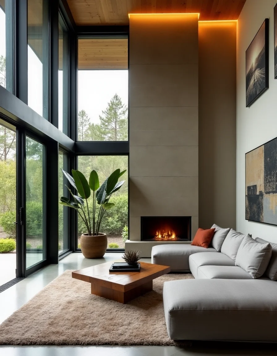 The living room is a stunning showcase of modern design, emphasizing a cohesive blend of wood, stone, and glass. Central to the space is a large, angular sectional sofa upholstered in soft gray fabric, paired with a sleek, reclaimed wood coffee table that features geometric lines. Against one wall, a striking stone feature fireplace provides a warm focal point, framed by large floor-to-ceiling glass windows which invite natural light and provide a view of the lush landscape outside. A plush, neutral-toned area rug grounds the seating area, while minimalist art pieces adorn the walls in earthy hues, enhancing the room's calm ambiance. Soft LED lighting is subtly integrated into the ceiling, providing a gentle glow that complements oversized houseplants placed near the windows, merging nature with modern aesthetic.