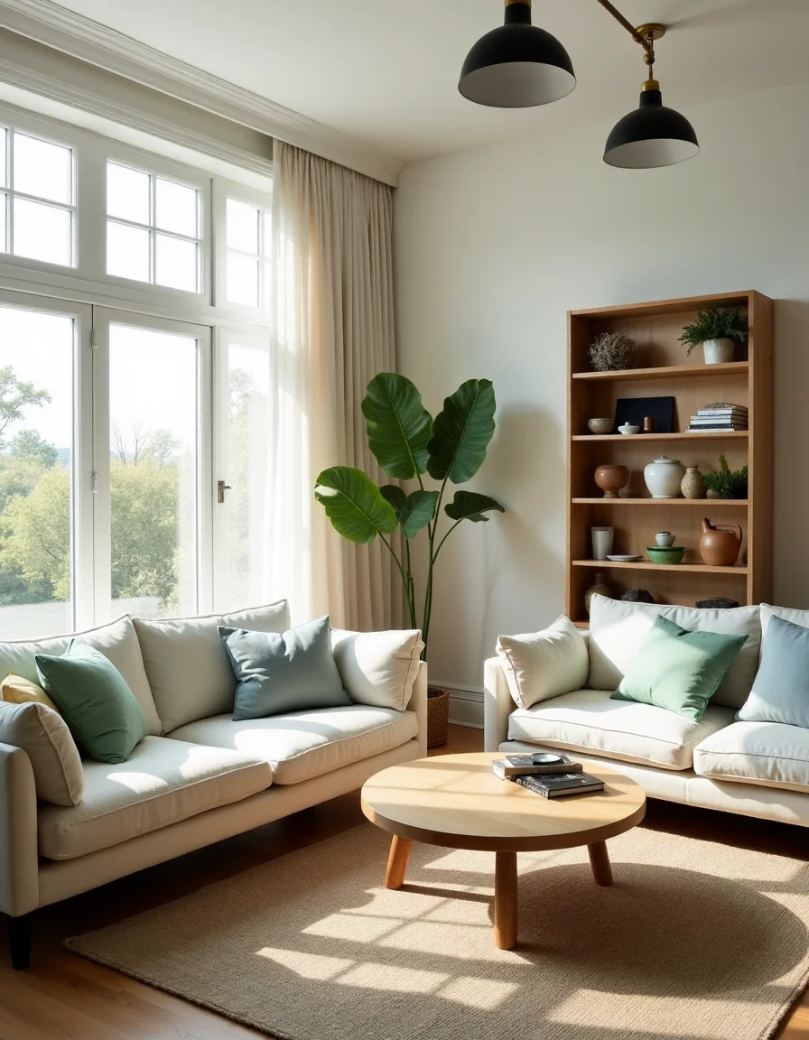 The living room embodies a harmonious Scandinavian style, illuminated by natural light streaming through expansive white-framed windows adorned with sheer linen curtains that softly flutter in the breeze. A light oak coffee table sits at the center, flanked by a pair of plush, off-white sofas accented with faded pastel blue and green throw pillows, inviting comfort and conversation. A handwoven wool area rug in muted earth tones provides warmth beneath, while a minimalistic pine bookshelf displays an arrangement of greenery in ceramic pots, curated books, and decorative objects featuring organic shapes. In the corner, a tall fiddle leaf fig tree thrives, establishing a serene connection to nature, further complemented by stylish, black and brass pendant lights hanging above, creating both functionality and style within this idyllic space.