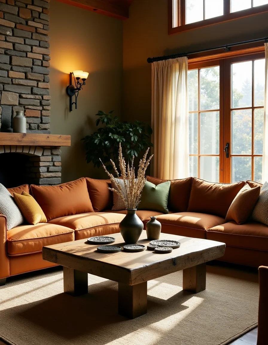 This rustic living room exudes warmth with its earth-toned color palette, featuring a large, comfy sectional sofa upholstered in rich, ochre-brown fabric, layered with mismatched throw pillows in muted greens and burnt oranges. A reclaimed wooden coffee table sits at the center, adorned with a few intricate stone coasters and a rustic vase filled with dried wildflowers. The walls are completed with exposed stonework, providing an organic touch, while ambient lighting from wrought-iron sconces softly illuminates the room, casting gentle shadows on a woven jute area rug that anchors the seating arrangement. A large, barn-style window draped with sheer linen curtains allows for plenty of natural light, enhancing the overall cozy, inviting atmosphere.