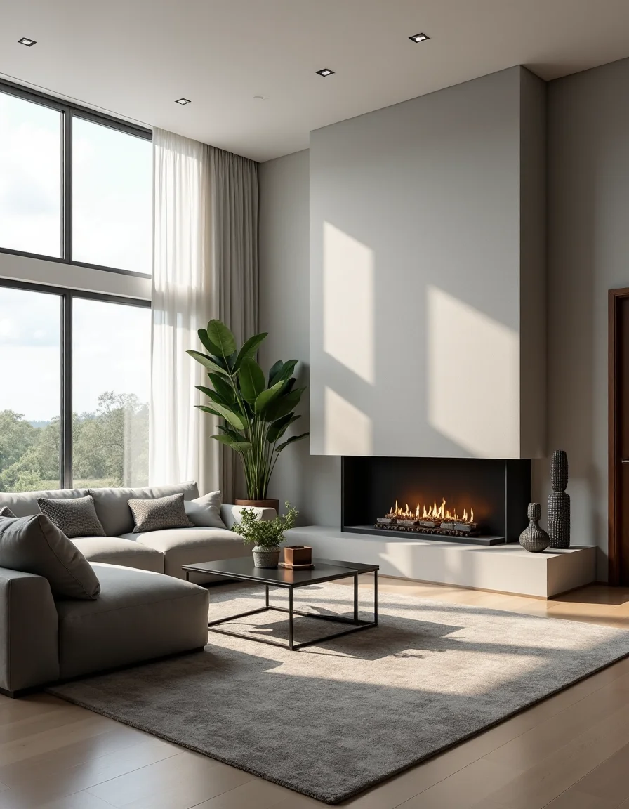 The modern living room features a spacious layout highlighted by clean lines and an open floor plan. A large sectional sofa in a soft charcoal fabric is positioned against a light gray accent wall, complemented by a sleek glass coffee table resting atop a textured area rug of muted tones. A minimalistic stone fireplace serves as the focal point, its smooth surface accentuated by a row of contemporary art pieces above it. Floor-to-ceiling windows invite abundant natural light, framed by sheer white curtains that gently billow in the breeze, while modern potted plants add a touch of greenery, enhancing the room's airy feel.