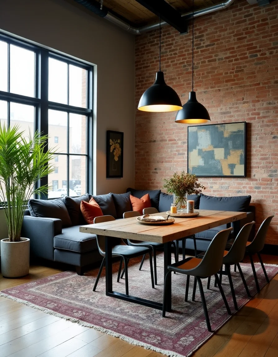 This industrial-style living room features a spacious layout centered around a robust, reclaimed wooden dining table with a weathered surface and sturdy black metal legs, serving as the heart of the space. Surrounding the table, there are mismatched vintage metal chairs in varying shades of gray and gunmetal, while a plush charcoal sectional sofa is arranged against the exposed brick wall, adorned with an array of deep blue and rust-colored throw pillows. Large floor-to-ceiling windows allow natural light to pour in, highlighting a distressed leather armchair positioned in the corner beside a tall fern in a raw concrete planter, adding a touch of greenery to the industrial palette. Touches of warmth emerge from layered rugs featuring geometric patterns, and elegant gold accents in pendant lighting and wall decor create a cozy yet edgy atmosphere.