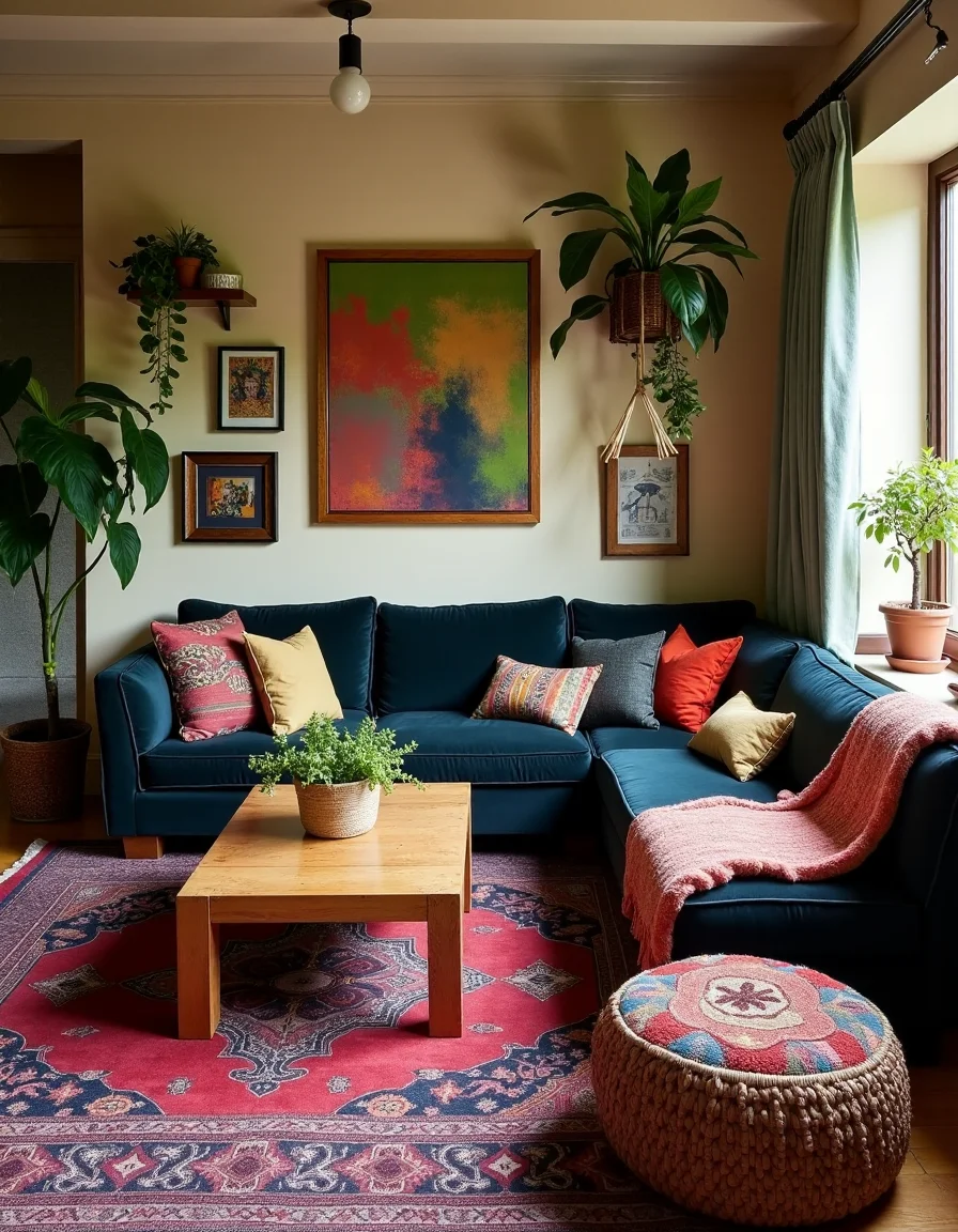 The living room embodies a warm and inviting bohemian style, characterized by a rich tapestry of varied furniture pieces meticulously arranged to create an eclectic yet harmonious space. A large distressed wooden coffee table sits at the center, surrounded by mismatched but complementary seating options: a dark velvet loveseat, a rattan chair draped with a colorful throw blanket, and a pouf adorned with intricate patterns. The walls are a canvas for an assortment of vibrant paintings, framed textiles, and macramé hangings, while plants like fiddle leaf figs and pothos cascade from rustic shelves, adding a touch of greenery. A vintage Persian rug in deep reds and blues anchors the room, harmonizing with layered handmade cushions sprawled across the seating, creating a relaxed atmosphere perfect for lounging or entertaining guests.