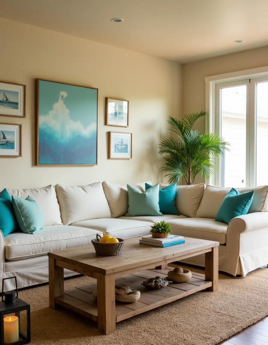 This charming seaside living room exudes a casual and laid-back vibe, perfect for relaxation. The walls are painted in a soft, sandy beige that creates a warm and inviting atmosphere. A large, off-white linen sectional sofa, adorned with azure blue and seafoam green pillows, is positioned centrally, inviting family and friends to unwind. Natural wooden elements are abundant, with a reclaimed wood coffee table showcasing driftwood accents, several nautical-themed art pieces hung framed lightly against the walls, and a sisal rug underneath to enhance the coastal feel. Potted palm plants and a decorative vintage lantern next to the large glass doors, which open to a sunlit patio, complete the serene ambiance, making this living room the perfect retreat by the shore.