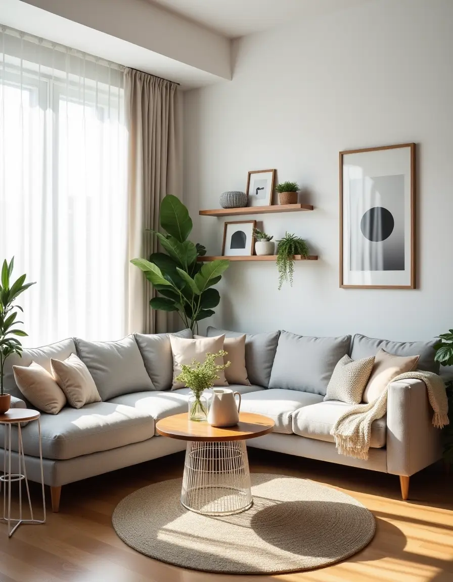 The living room embraces a Scandinavian style with its emphasis on functionality and coziness. A large, plush, light gray sectional sofa occupies one side, adorned with a mix of cream and pastel throw pillows that enhance the inviting atmosphere. Natural light streams through sheer white curtains, illuminating the space and highlighting the warm wooden accents like a mid-century oak coffee table at the center, flanked by two minimalist, white wire-frame side tables. Lush greenery spills from strategically placed potted plants, including a tall fiddle leaf fig by the window and small succulents on shelves, while a soft, woven area rug in muted tones anchors the seating area and adds texture. The walls are painted a crisp white, adorned with simple black-and-white photography in wooden frames, reinforcing the clean lines and airy ambiance typical of Scandinavian design.