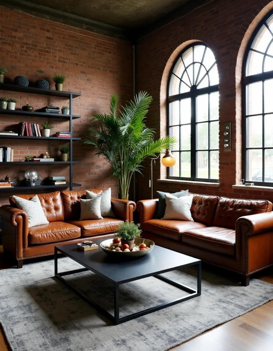 The living room features an industrial style characterized by its raw aesthetic and a blend of modern and vintage elements. Exposed burnt brick walls provide a rugged backdrop, while an oversized black steel-framed coffee table is centrally placed atop a soft, distressed gray area rug. Flanking the table are a pair of tufted leather sofas in a rich, deep brown, complemented by an eclectic mix of throw pillows featuring muted colors and abstract patterns. The room's ambiance is enhanced by sturdy iron shelves lined with books and plants, while large, arched windows with black metal frames allow natural light to seep in, illuminating a stylish vintage floor lamp in the corner and giving the space a cozy yet edgy vibe.