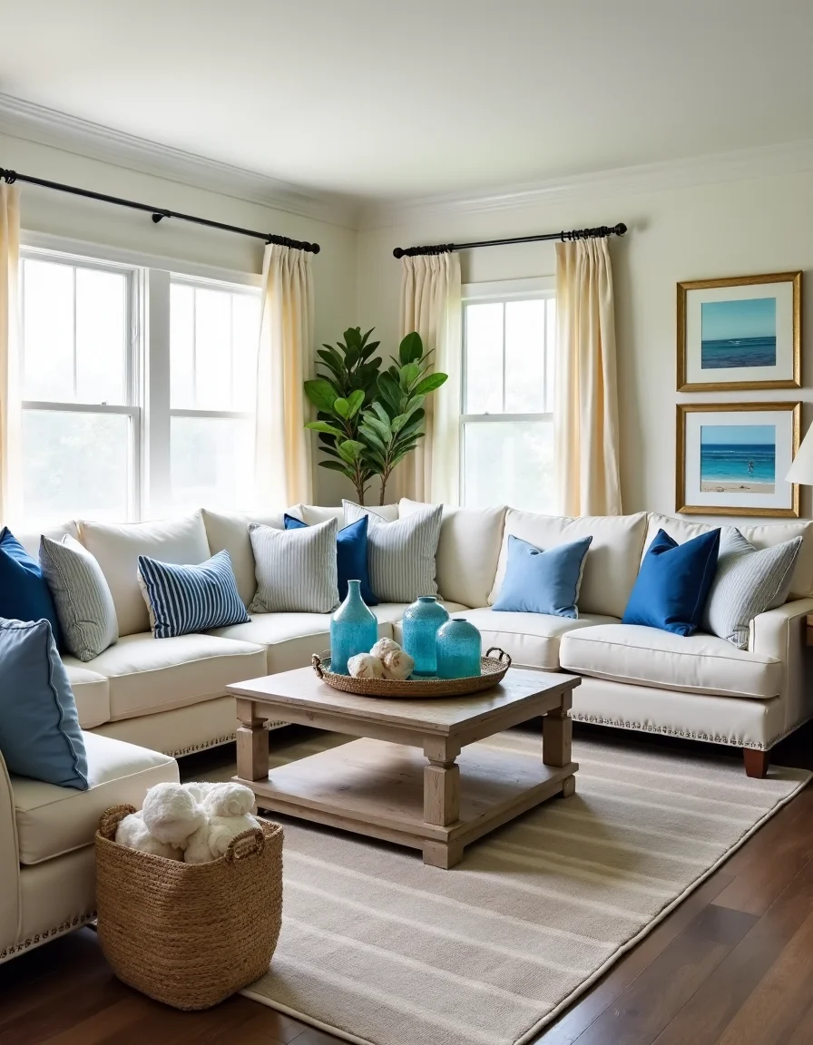The living room embraces a serene seaside aesthetic, marked by soft blue and sandy beige hues that evoke coastal tranquility. A large, plush sectional sofa, upholstered in a light, breathable fabric, anchors the room, adorned with an assortment of striped pillows in varying shades of cobalt and cream for a playful yet calming effect. Below, a soft, striped area rug in sandy tones adds warmth and subtle texture, while a driftwood coffee table, weathered and sun-bleached, sits at the center, surrounded by blue glass decor pieces that mirror the ocean waves. The walls are tastefully adorned with framed seashell prints and lightweight sheer drapes billow gently at the windows, allowing natural light to flood the space and create a breezy, inviting atmosphere. Potted succulents and a wicker basket filled with beach towels enhance the natural flow, completing the relaxed coastal vibe.