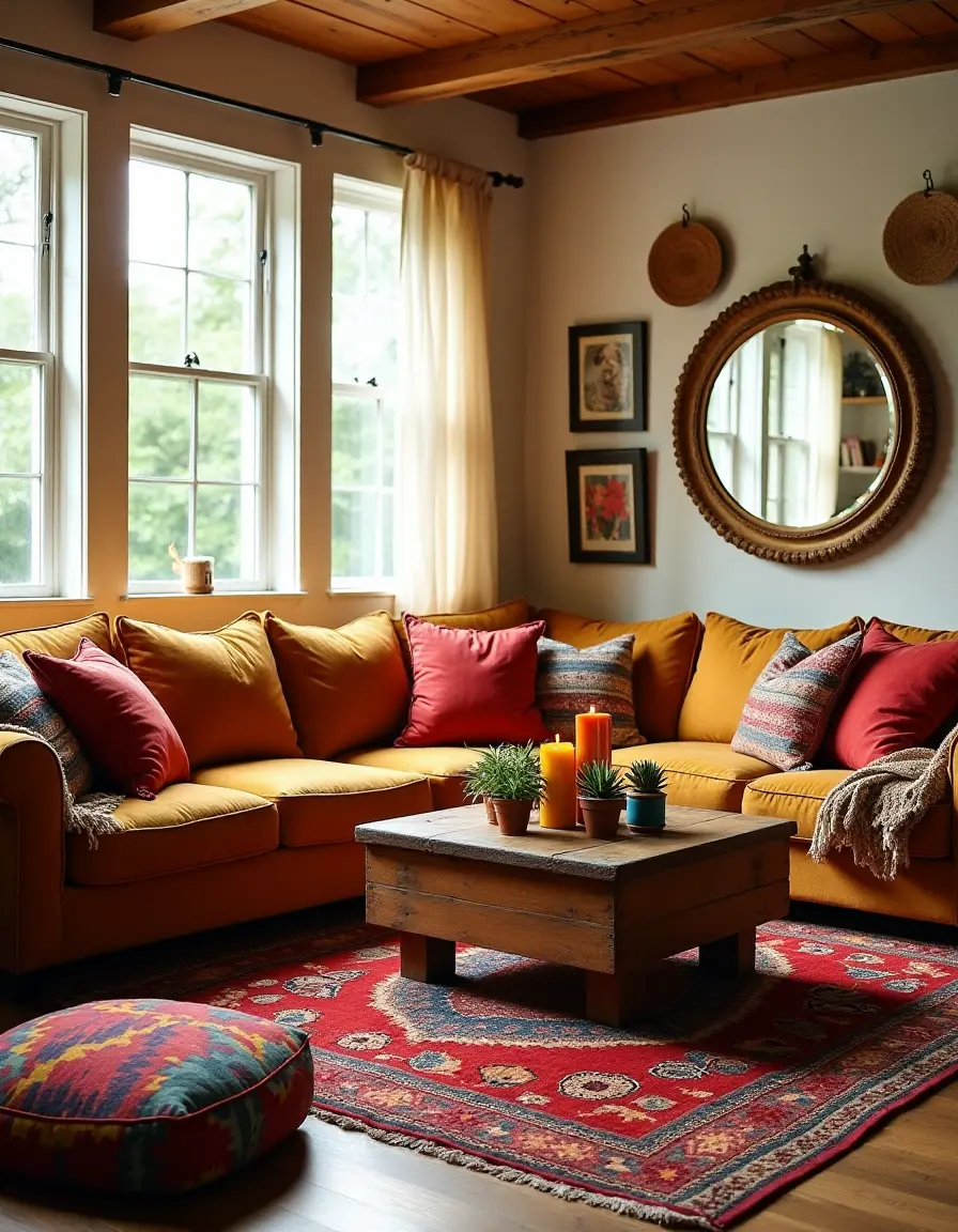 The living room exudes an eclectic bohemian charm, featuring a large, plush, earth-toned sectional sofa adorned with vibrant, patterned throw pillows in rich reds, deep blues, and sunny yellows. An oversized, intricately woven ethnic rug with geometric designs lies beneath a vintage coffee table made from reclaimed wood, decorated with a handful of potted succulents and an eclectic assortment of colorful candles. The walls are adorned with an assortment of artwork, including woven wall hangings, framed ethnic prints, and a large mirror with a decorative wooden frame that reflects the natural light streaming in from the three wide windows draped with sheer, flowy fabrics. Adding to the cheerful and relaxed atmosphere, a couple of floor cushions in bright patterns invite casual seating, and a small bookshelf brimming with books and curiosities completes the inviting space.