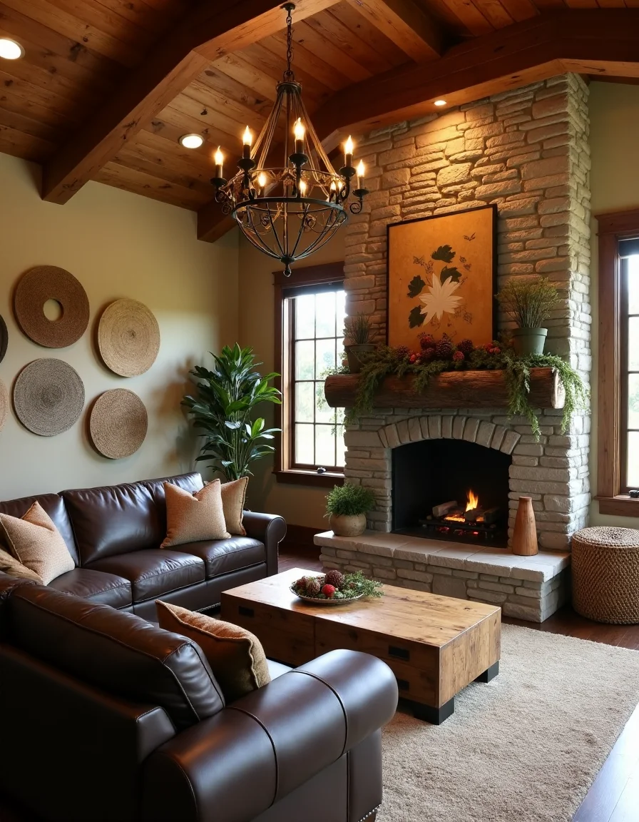 The living room is a cozy retreat, adorned with rich wooden beams that stretch across the ceiling, emphasizing its rustic charm. A large sectional sofa, upholstered in dark brown leather, is positioned in an inviting semicircle around a reclaimed wood coffee table, its surface artfully scarred, telling stories of yesteryears. On the walls, various artisanal crafts such as woven tapestries and hand-carved wood frames showcase family memories, while warm, golden lighting spills from an iron chandelier hanging above, casting gentle shadows around the room. A large stone fireplace sits at one end, equipped with a chunky log mantle decorated with seasonal greenery and rustic pinecones, creating a serene ambiance speckled with earthy tones of deep greens, burnt oranges, and rich browns.