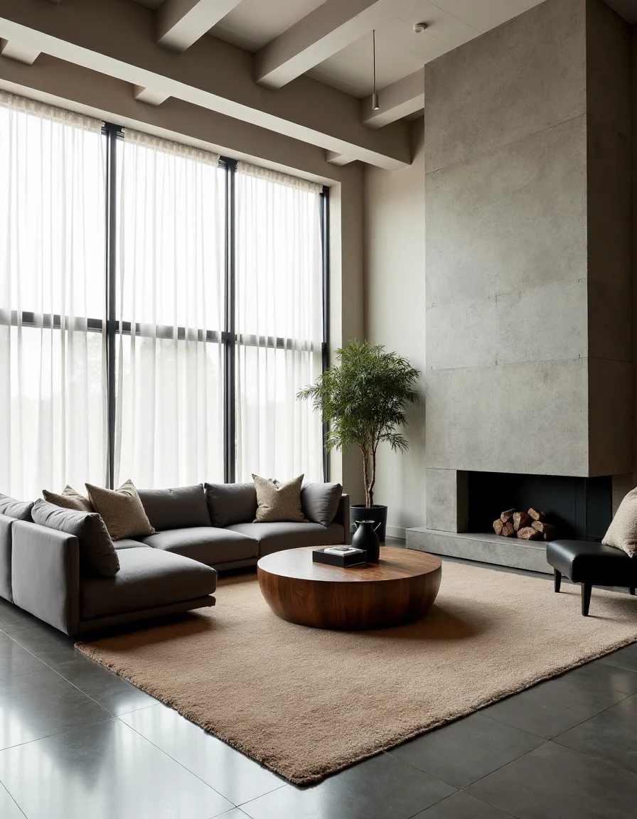 The living room features a sleek, modern aesthetic, characterized by a polished concrete floor that extends seamlessly beneath a tailored beige area rug, providing warmth and texture. A low-profile grey sectional sofa, adorned with minimalistic geometric patterned throw pillows in muted tones, anchors the space while being positioned to face a contemporary stone fireplace, which boasts a simple blackened steel mantel, perfect for gathering around in cooler months. A large, unobtrusive coffee table made of reclaimed wood rests at the center, flanked by two matte black accent chairs that complement the industrial vibe. Natural light floods the room through expansive floor-to-ceiling windows, which are dressed with sheer white curtains that soften the starkness of stone and concrete, while a potted snake plant in one corner adds a touch of green.