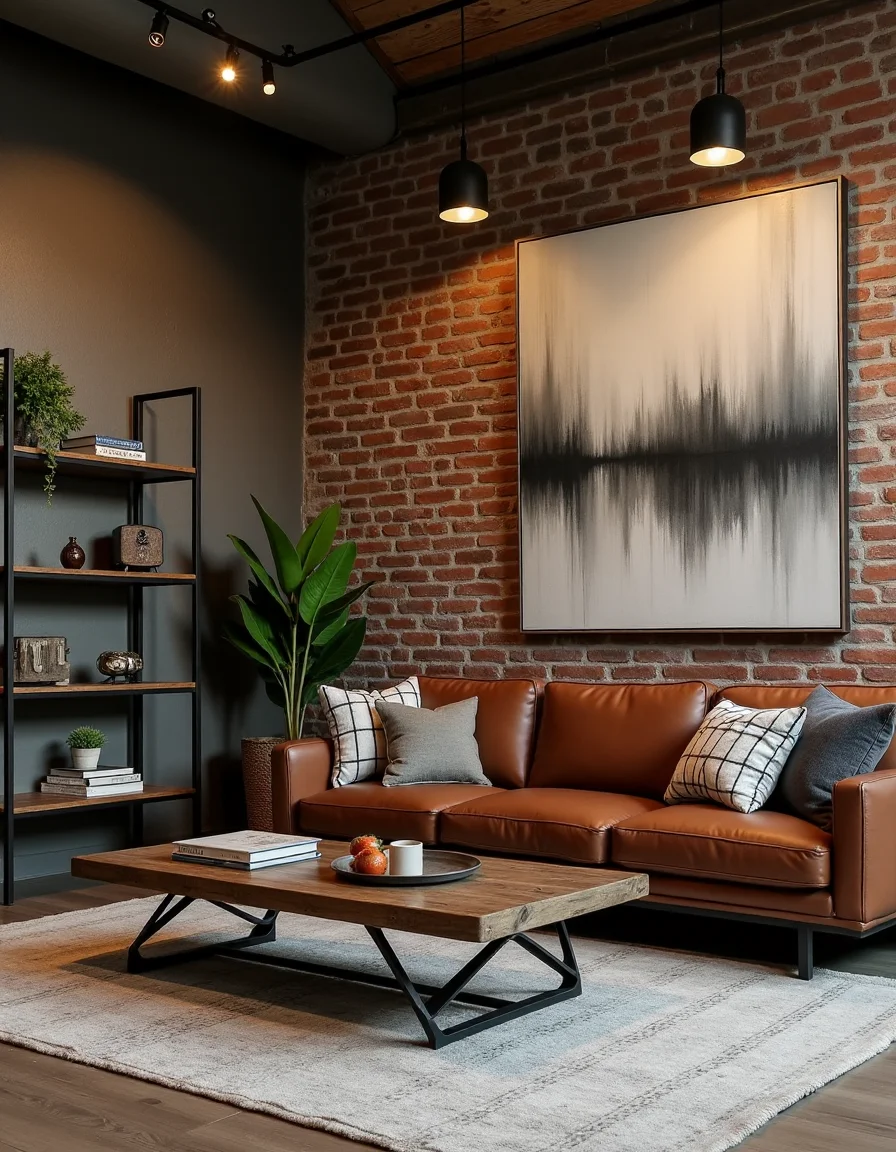 The living room is designed with a captivating industrial style, showcasing raw, unfinished elements where comfort meets function. A large, deep brown leather sofa is positioned against a wall of exposed burnt brick, accentuating the rustic character of the space. A low, reclaimed wood coffee table sits at the center, its dark hues accented by matte black metal legs. To one side, an aged steel shelving unit holds a few potted plants and vintage books, while an oversized abstract painting in muted tones hangs artistically above it. Pendant lights with blackened metal finishes drop from a high ceiling, casting warm light across the transition between metal and natural textures in this inviting yet undeniably edgy environment.