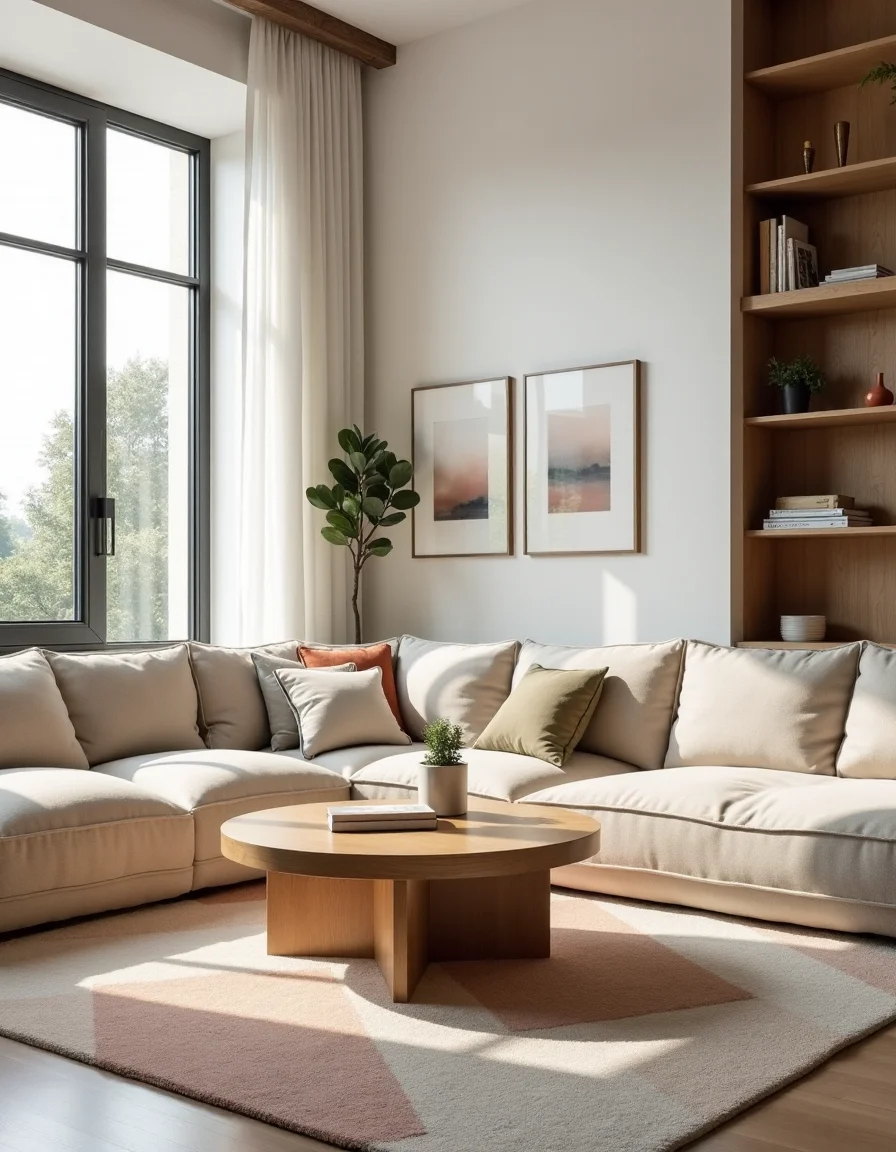 The living room boasts a Scandinavian design that emphasizes brightness and functionality, featuring a spacious layout with ample natural light streaming in through large, floor-to-ceiling windows adorned with sheer white curtains. Centered is a plush, light beige sectional sofa, arranged invitingly around a sleek, round wooden coffee table made of light oak, showcasing minimalistic decor such as a hardcover book and a small potted succulent. A beautiful area rug in soft pastels adds warmth beneath the furniture, while a tall, elegant shelf in natural wood displays a mix of greenery and tasteful ceramics, creating a sense of balance in the space. The walls are painted in a soft, calming white, adorned with a few framed abstract artworks with pops of muted colors, and vertical wooden beams peek through the ceiling, enhancing the rustic yet modern character of the room.