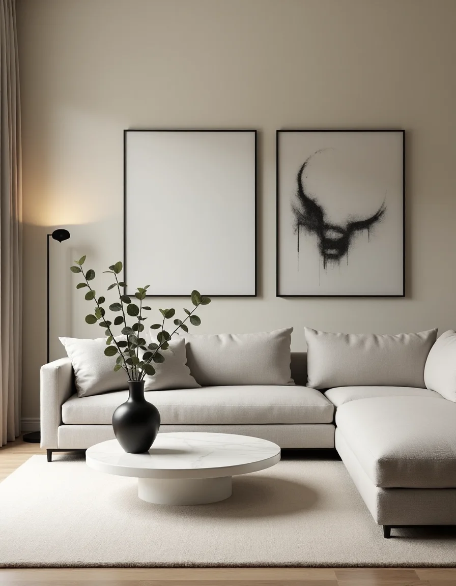 The living room exudes a peaceful minimalist aesthetic with an emphasis on negative space and simplicity. A large, light gray sectional sofa occupies the center of the room, its low profile and sleek lines enhancing the overall calmness. A round, white marble coffee table rests in front of the sofa, paired with a single, elegantly designed black ceramic vase holding fresh eucalyptus branches, bringing a touch of nature into the space. The walls are painted a soft, muted beige, complemented by an abstract black and white art piece that hangs above the sofa. Additional details include a textured wool area rug in a light tone under the coffee table, and a tall floor lamp with a thin black frame, strategically positioned in one corner to provide subtle illumination without cluttering the visual flow.