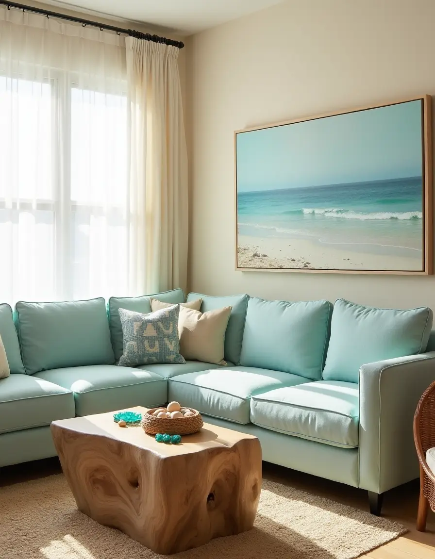 The seaside-inspired living room features light beige walls that reflect the coastal vibe, complemented by a large, plush sofa upholstered in a soft aqua blue fabric. To the left, a driftwood coffee table sits at the center, adorned with a collection of sea-glass coasters and a woven basket filled with shells. On the right, a pair of rattan accent chairs—each with beige cushions—encircles a natural fiber rug that adds warmth to the space. Coastal-themed artwork depicting serene ocean scenes hangs above the sofa, while sheer white curtains flutter slightly in the breeze, allowing sunlight to flood the room, creating a tranquil and inviting atmosphere.