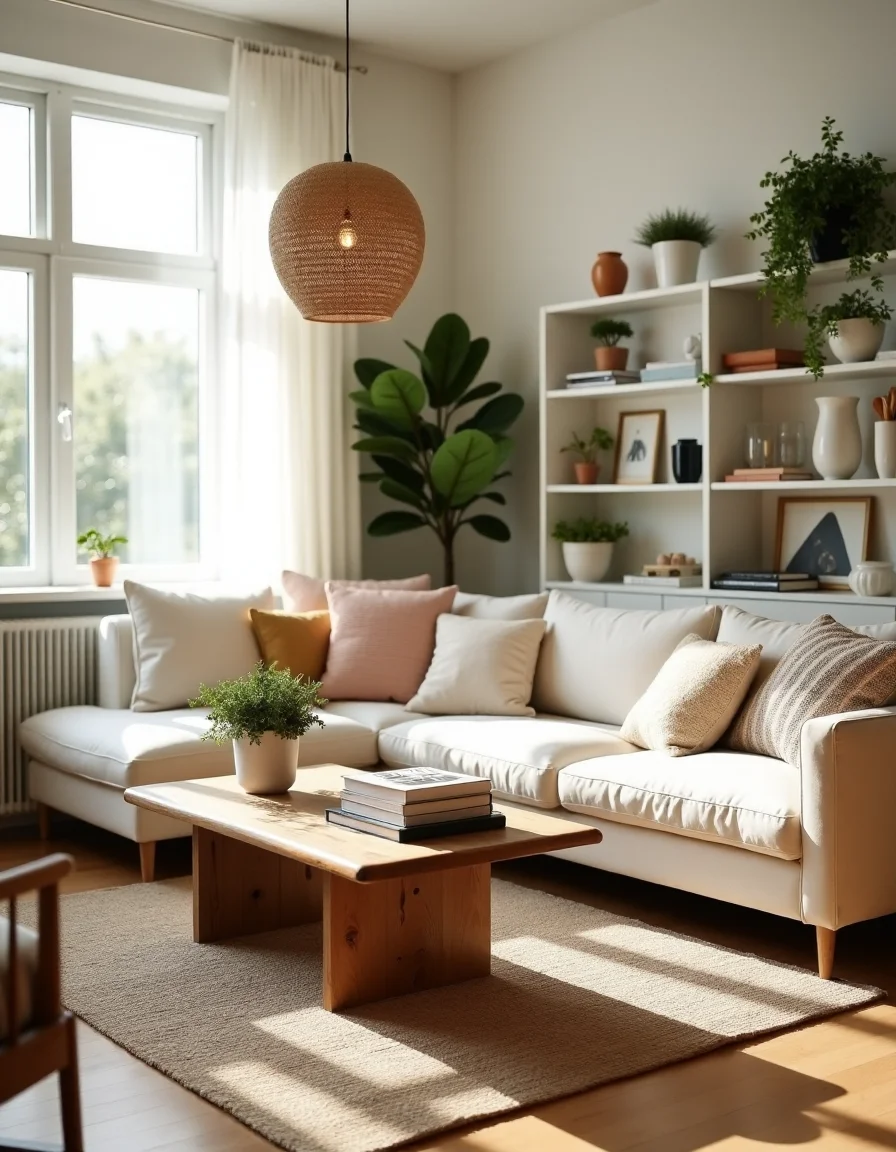 The living room embodies a harmonious Scandinavian style, characterized by light wood flooring and pale, sun-kissed walls that reflect the natural light streaming in through large, sheer curtains. A plush, cream-colored sectional sofa, adorned with knitted throw pillows in soft pastels, invites relaxation and conversation on a lovingly woven area rug in a geometric pattern. A rustic oak coffee table sits at the center, topped with a small potted fern and a stack of art books, while a minimalistic white bookshelf filled with various decor items, such as ceramic vases and framed photographs, lines one wall. To accentuate the cozy ambiance, pendant lighting made of natural woven materials hangs overhead, and a few hanging plants add a touch of greenery, seamlessly blending nature and design into a tranquil retreat.