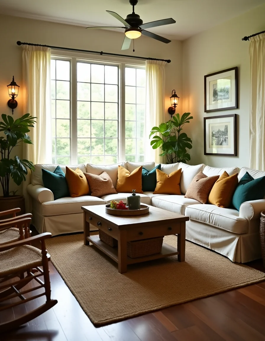 The living room exudes a cozy country charm, bathed in warm natural light that streams through sheer white linen curtains draped elegantly over tall windows. A spacious, inviting sectional sofa upholstered in soft beige slipcovers occupies the center, adorned with an array of earth-tone throw pillows in rich ochre and forest green shades. An oak coffee table with a rustic finish sits atop a braided jute rug, while a pair of antique wooden rocking chairs flanks one side, each topped with woven baskets for storage. The walls are decorated with vintage farmhouse prints and an assortment of potted plants, bringing the outdoors inside and enhancing the tranquil, earthy aesthetic. Accent lighting from wrought-iron sconces casts a gentle glow, creating a warm and welcoming atmosphere, perfect for family gatherings or quiet evenings spent with a good book.