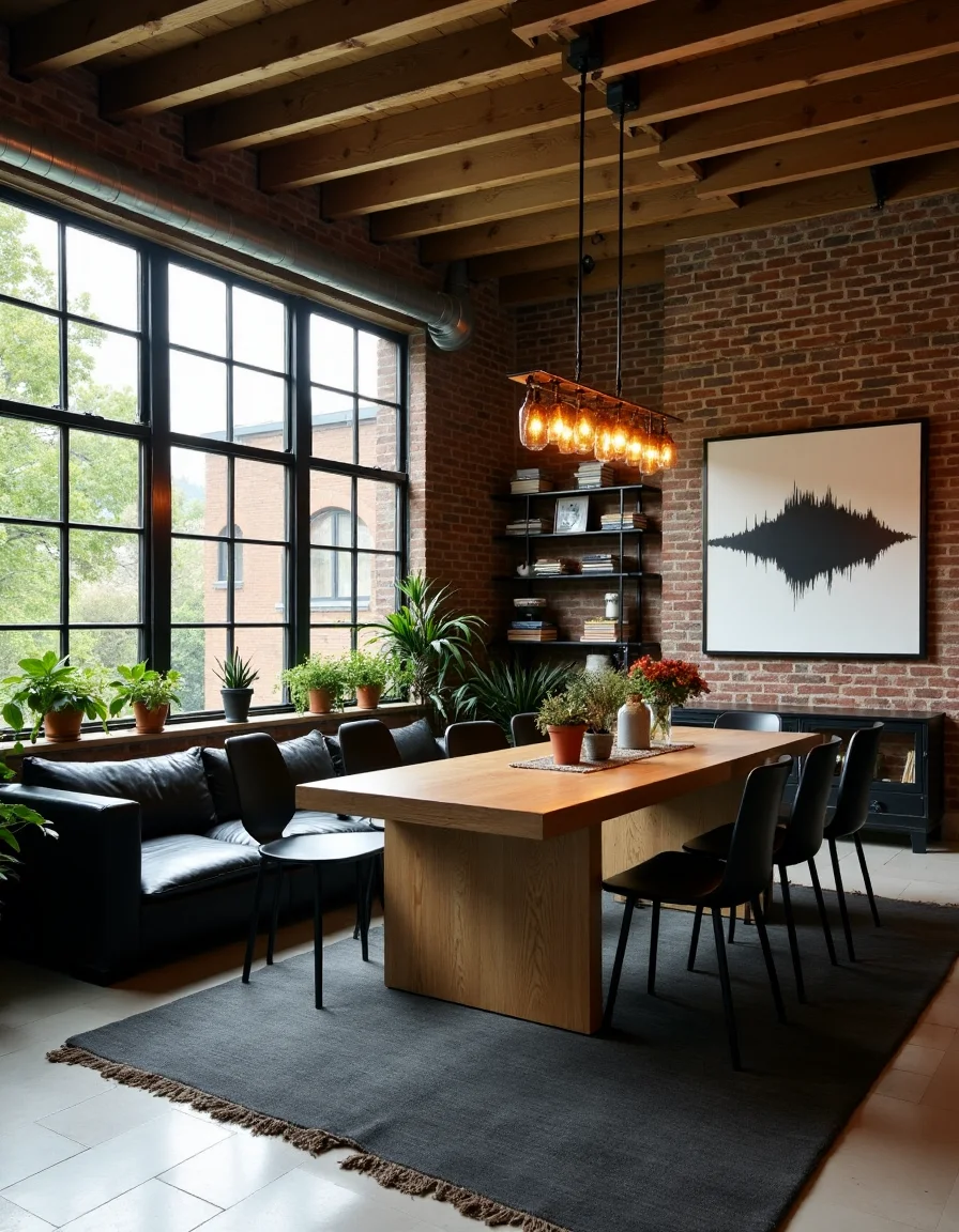 The living room embodies an industrial charm with its solid oak wooden dining table, prominently centered on a deep charcoal-gray area rug that adds warmth to the stone tile floor. Exposed brick walls provide a rugged backdrop, accentuated by metal pipe shelving laden with various plants and vintage books. Black leather sofas flank the table, their sleek lines contrasting with an oversized rusty metal chandelier hanging above, casting a warm glow. A striking abstract painting in monochrome tones adorns one wall, while large, industrial-style windows allow natural light to stream in, embodying an atmosphere of urban sophistication.