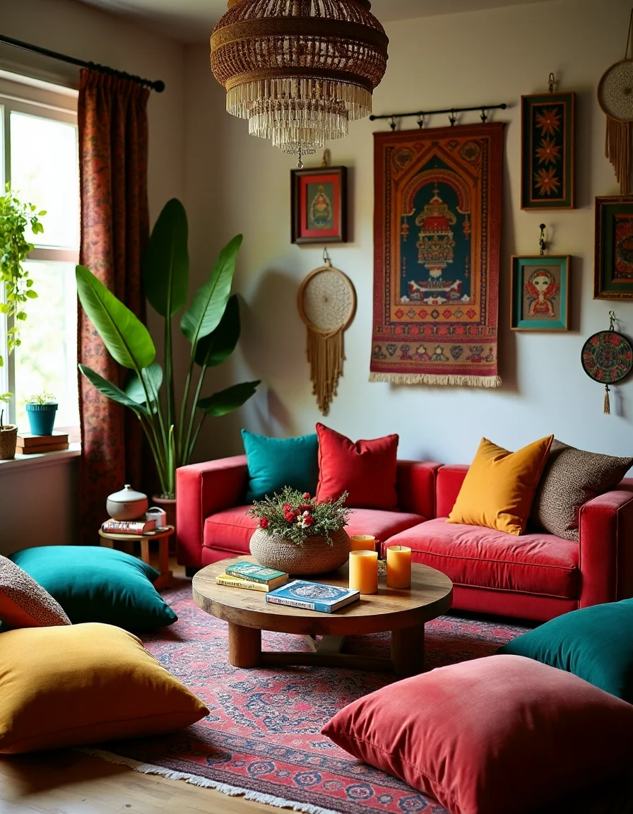 The living room is a vibrant bohemian haven bursting with eclectic charm. Plush, oversized floor cushions in rich jewel tones like deep emerald, ruby, and mustard are scattered generously across a lightly patterned, vintage Persian rug. A large, low coffee table made from reclaimed wood sits centrally, topped with an assortment of colorful candles, an intricately woven basket filled with dried flowers, and stacked art books featuring diverse cultural art. The walls are adorned with an array of framed ethnic textiles and handcrafted dreamcatchers, while hanging plants in macramé hangers add a touch of greenery, enhancing the warm, inviting ambiance of the space. Overhead, an ornate chandelier made of wrought iron and crystals dangles, reflecting scattered light across the room, casting enchanting shadows on the walls adorned with layers of tapestries.